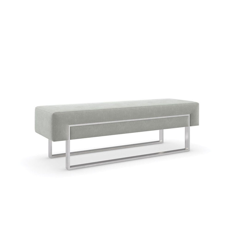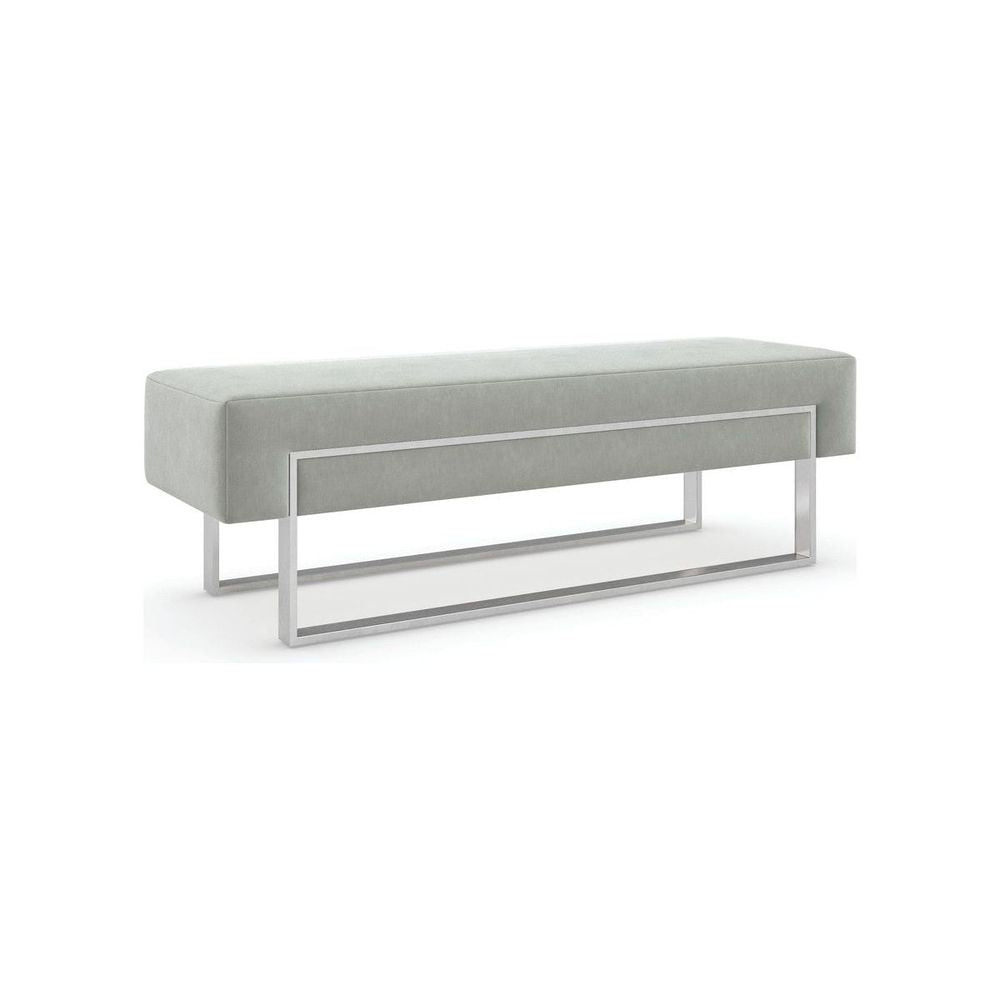 A soft landing at the start or end of day, this multifunctional bench lends a sophisticated finishing touch in a dove-colored velvet. An artful interpretation of Euro-modern simplicity and balance, its minimalist base adds a metallic accent in Smoked Stainless Steel. Perfect for the end of bed, or as a sleek seat in the hall or entryway.
