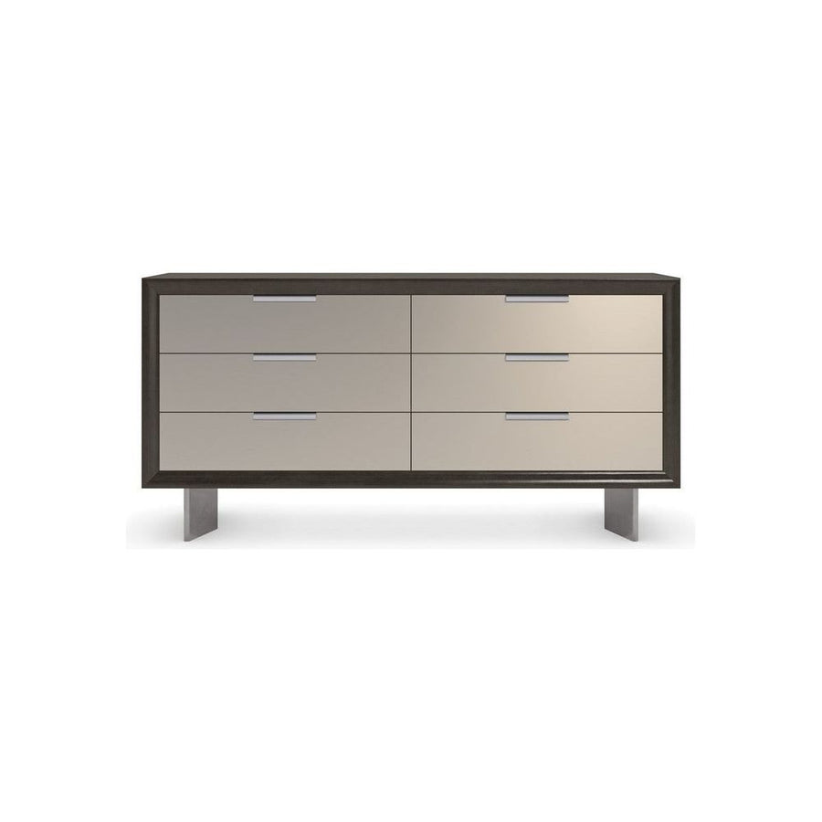 Bold lines and bronze mirror define this architecturally inspired dresser. Dramatic, yet unpretentious in a modest mix of materials, its sleek design lends a contemporary vibe that seamlessly aligns with other pieces from our collection. Grooved metal pulls add a surprise tactile experience, coolly complemented by drawer interiors in Soft Silver paint. A floating jewelry tray in the top left drawer keeps watches, spectacles, and cufflinks neatly tucked away and still within close reach.