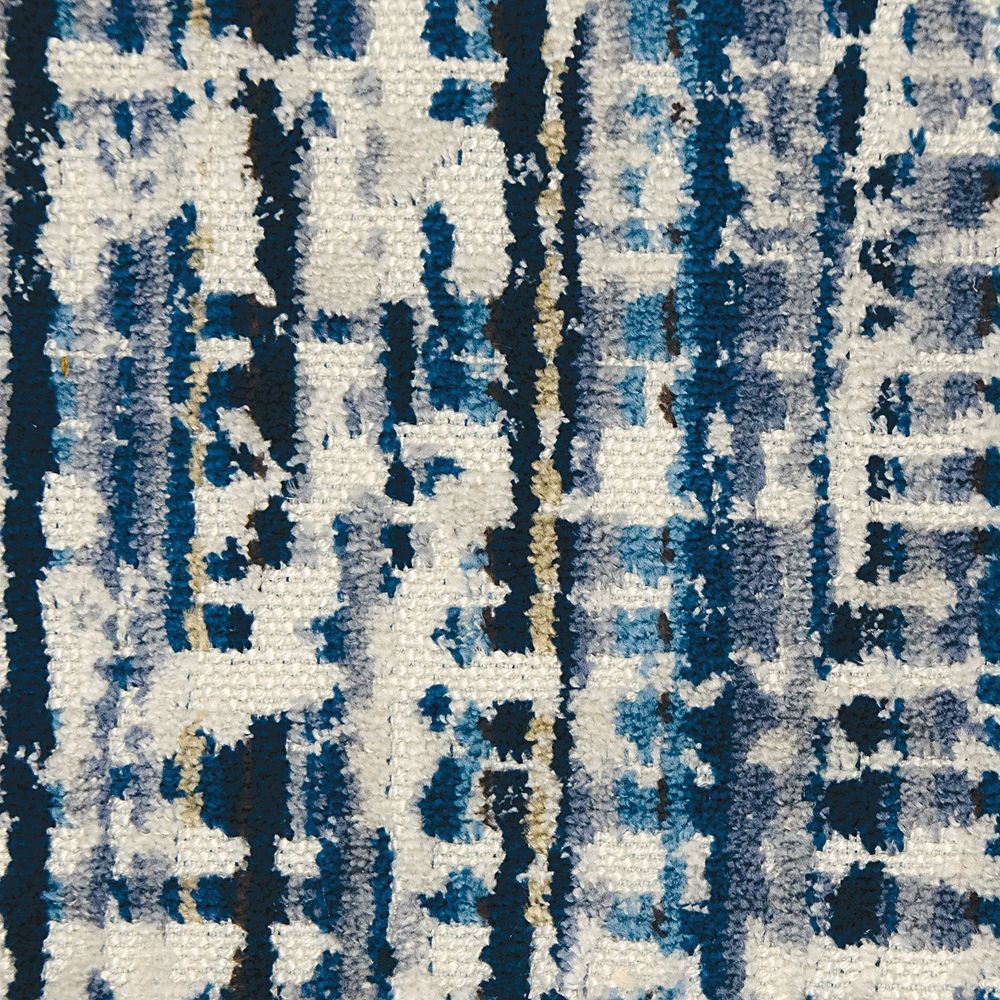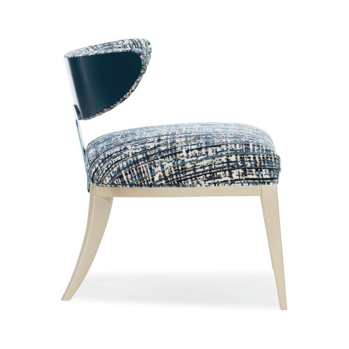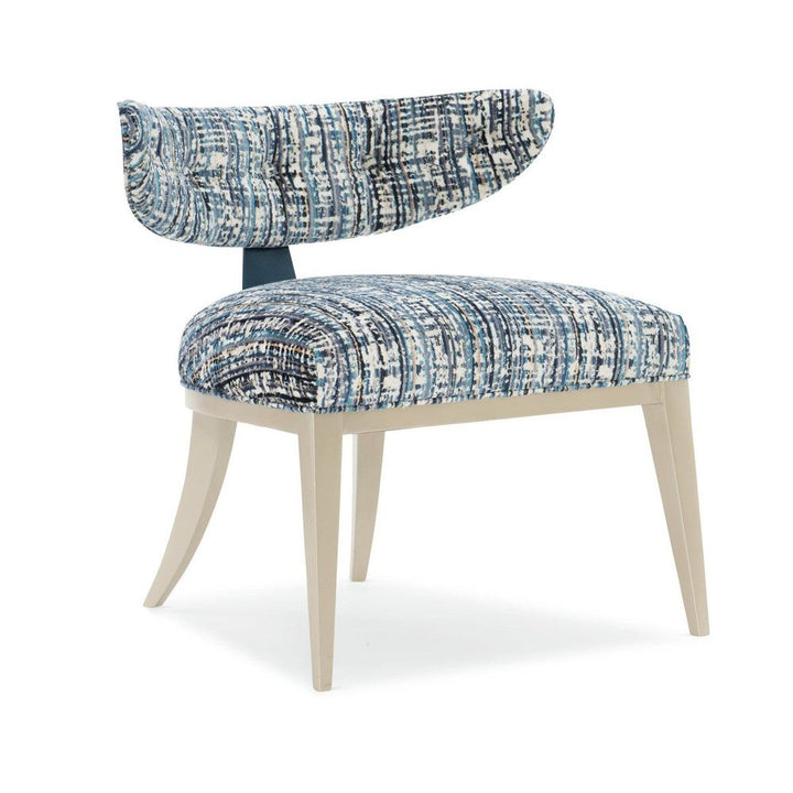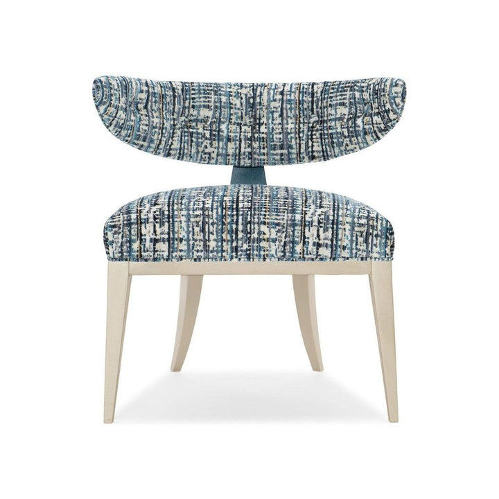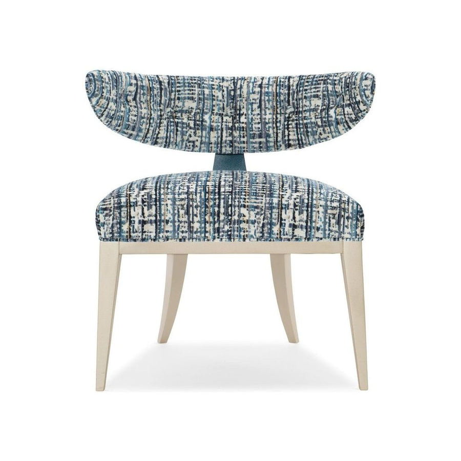 A modern beauty, this shapely chair offers brilliance in every curve. Inspired by the splendor of a geyser erupting with steam and water, it blends shades of cerulean blue and smoke grey with a Dusty Silver finish. Its metal crescent back is finished in a bold shade of cerulean blue and appears to float above its upholstered seat cushion. A richly textured graphic pattern of cerulean and smoke adds depth and dimension to the seat cushion and inside seat back, while button tufting adds a designer touch. Its lasting character feels retro-inspired yet thoroughly fresh and modernized.