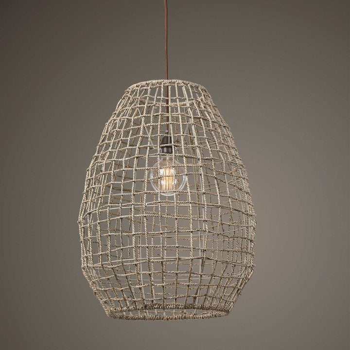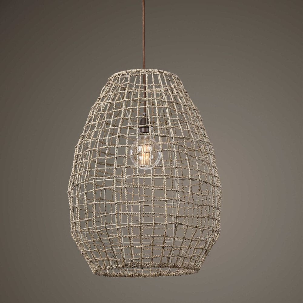 Natural woven sea grass in a cross weave pattern gives us this wonderful airy 1 lt pendant with brushed agaed bronze details. Supplied with 1-60 watt max Edison socket and includes 15'cord for adjustable installation.