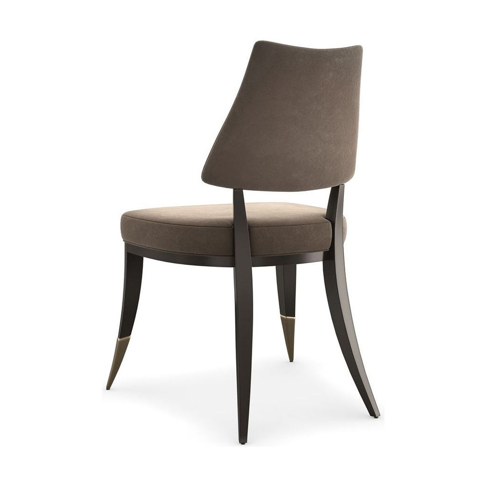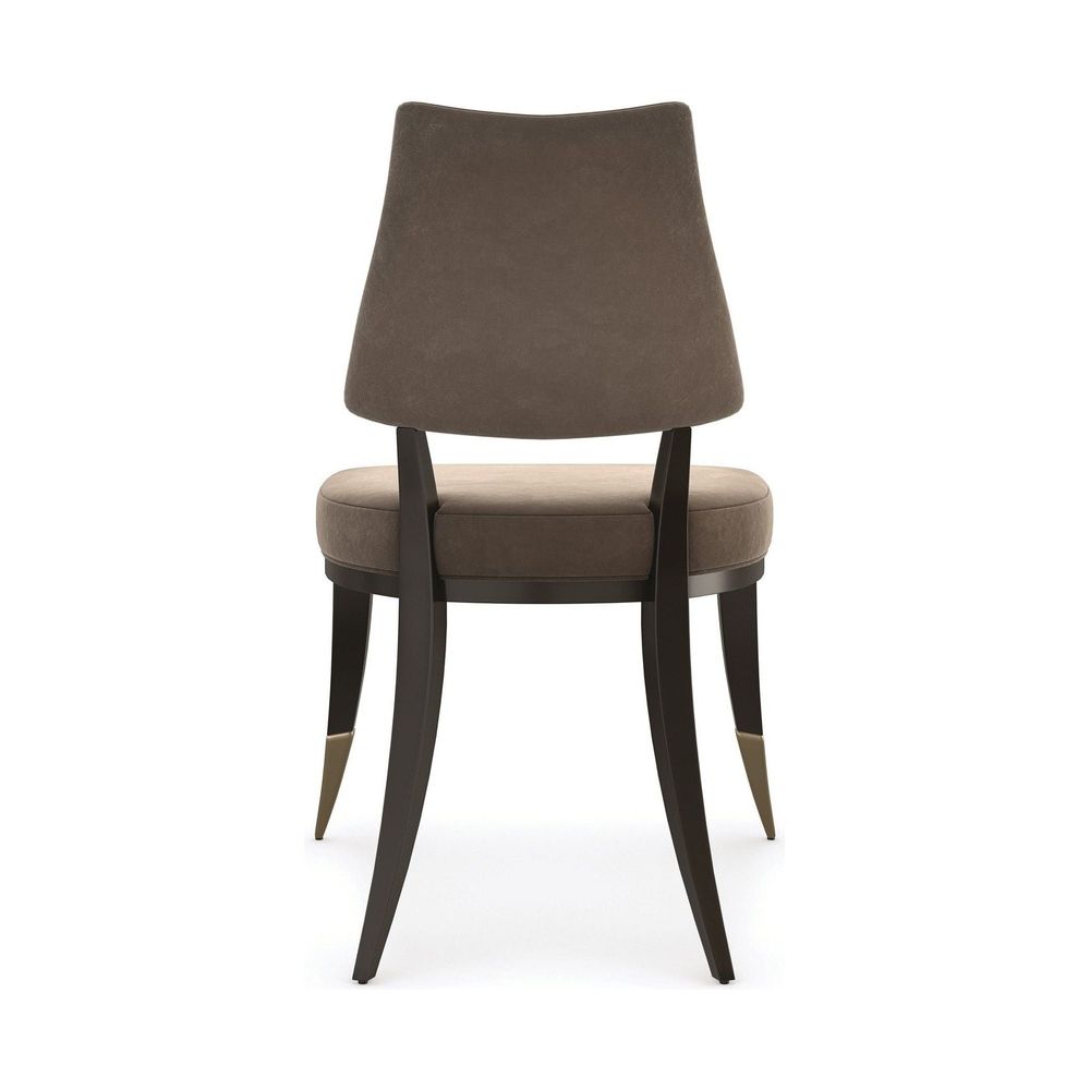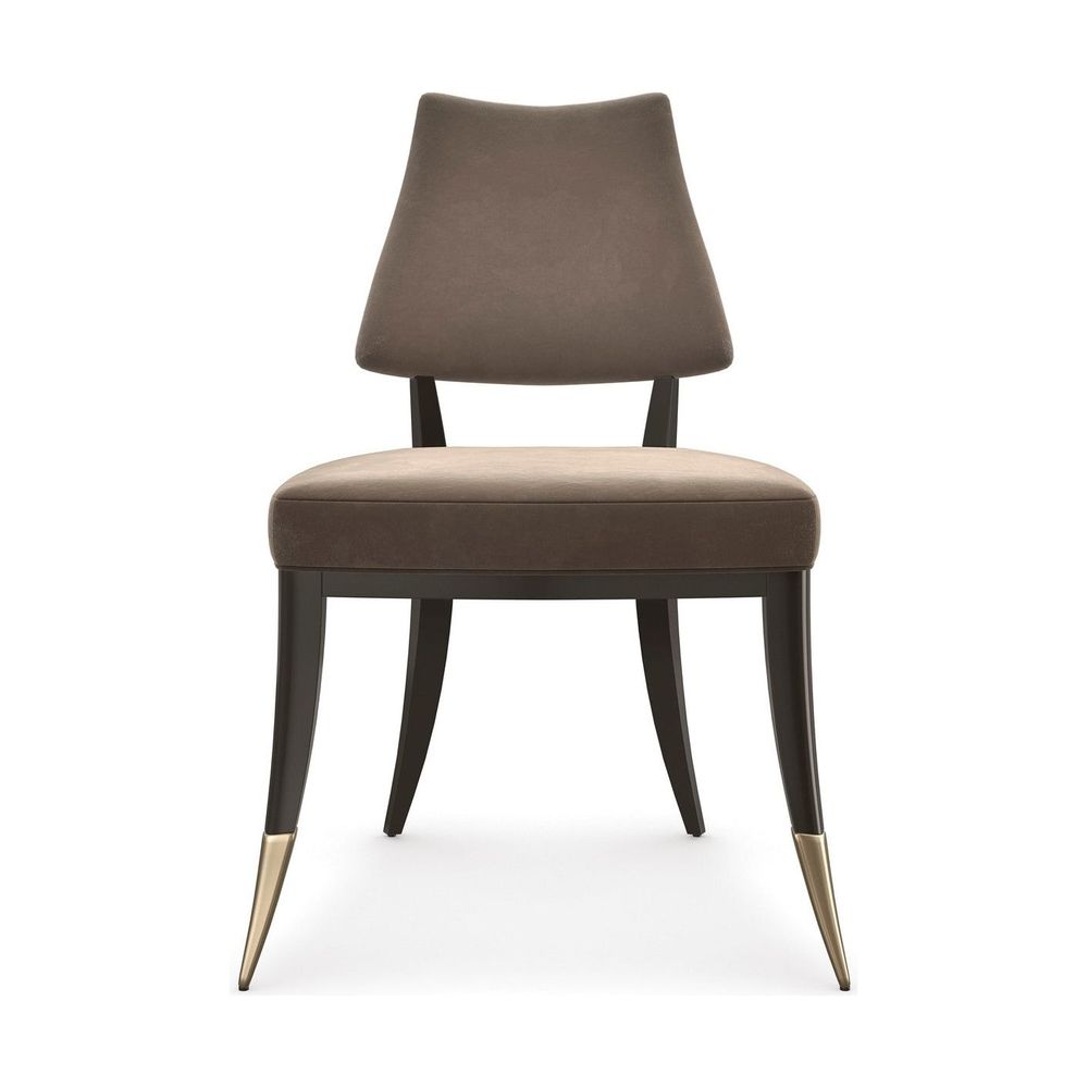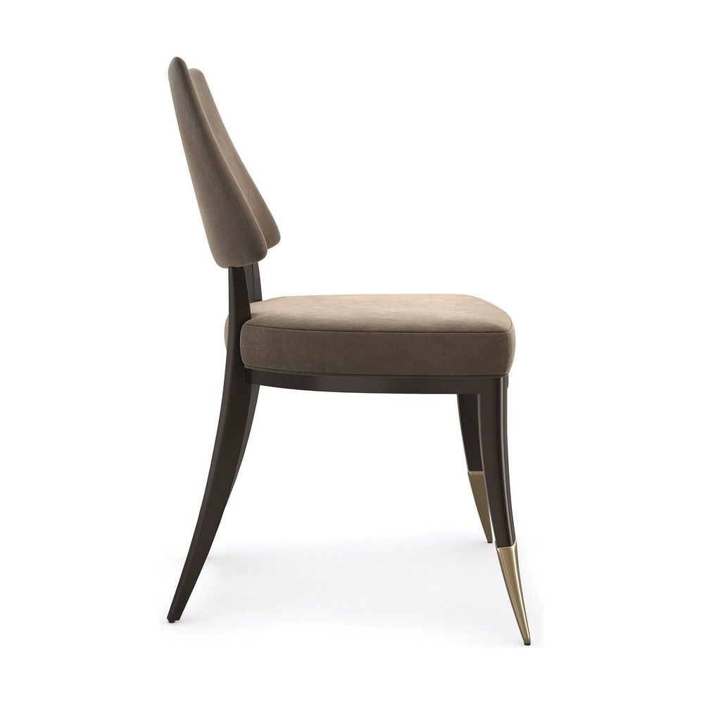 Reminiscent of a French antique, this petite dining chair features a soft, sculpted back and plush seat, perfect for entertaining and lingering conversations around the table. Tall, tapered legs with an outward curve are the perfect complement to this soulful silhouette, impeccably dressed in a smoky taupe velvet. Brushed Gold metal ferrules lend a luxe finishing touch.