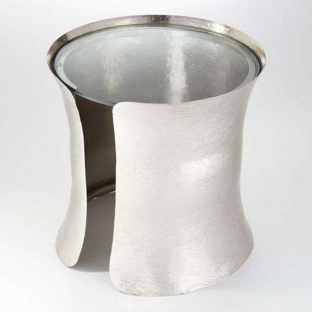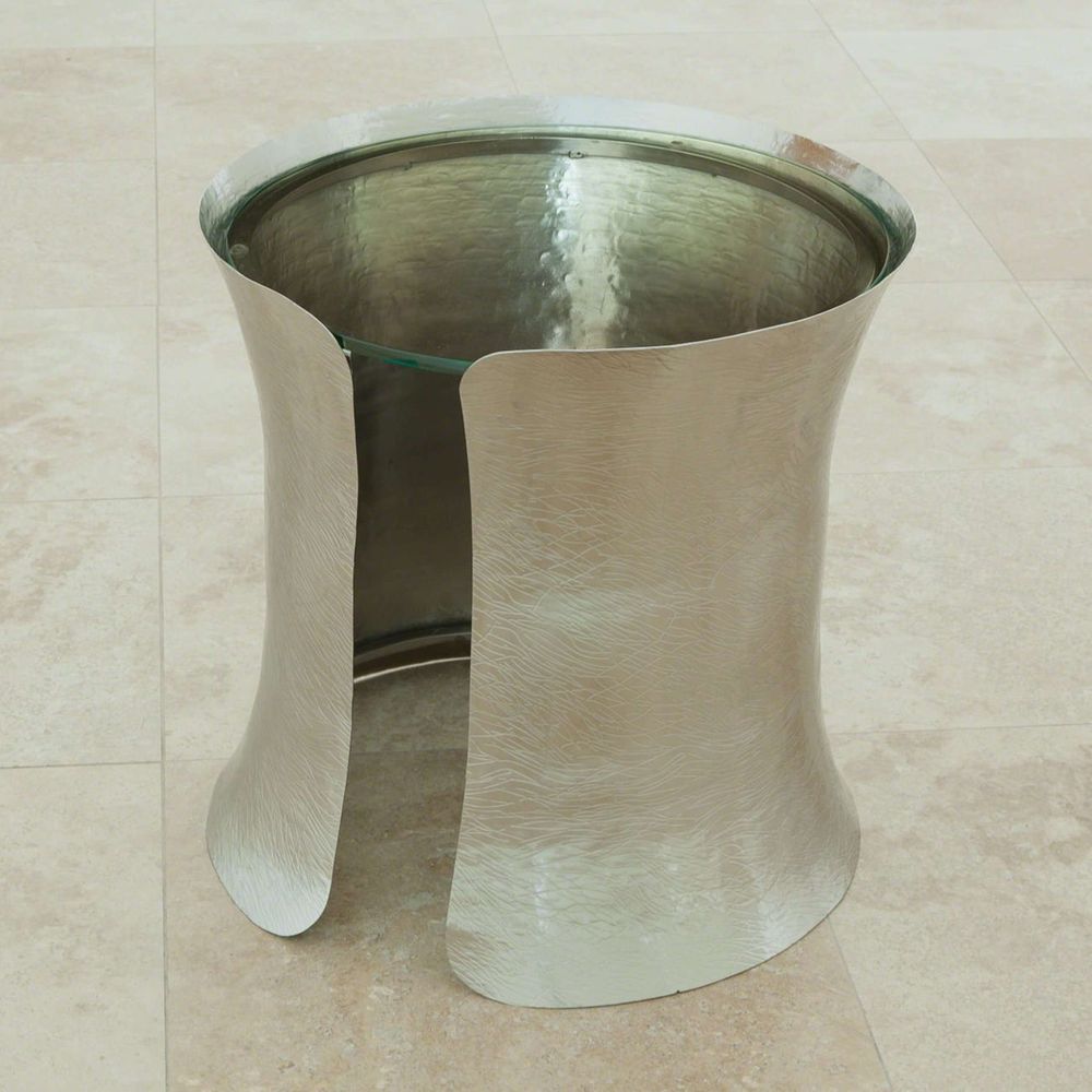 Inspired by your favorite basic wrist cuff. This scratched texture nickel plated table is jewelry for your room. Glass top. Adjustable glides