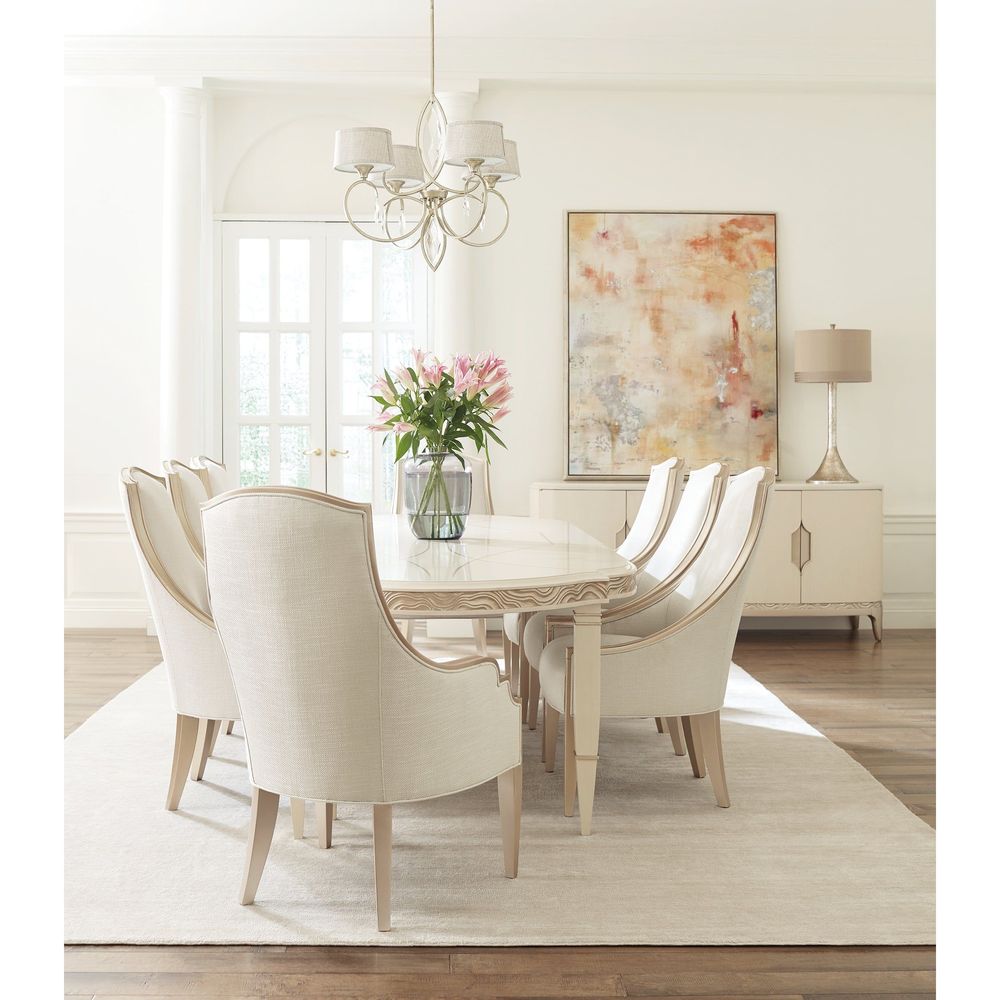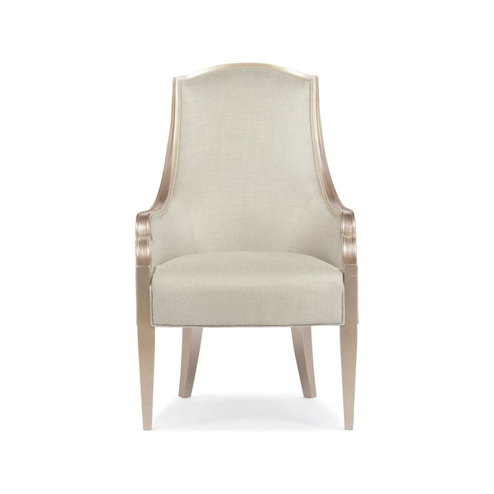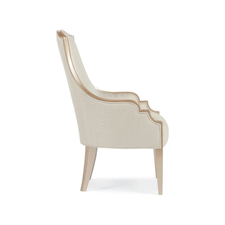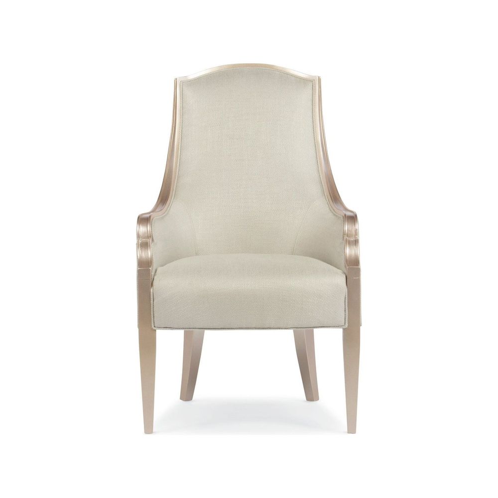 The Adela Arm Chair is a statement in refinement. Its clean lines feature a high back that reveals a gracefully carved frame in metallic Blush Taupe that sweeps around the back and down the arms of the chair to modern tapered legs. Dressed in cream tweed boucle fabric this chair has the elegance of an impeccably tailored Chanel suit.