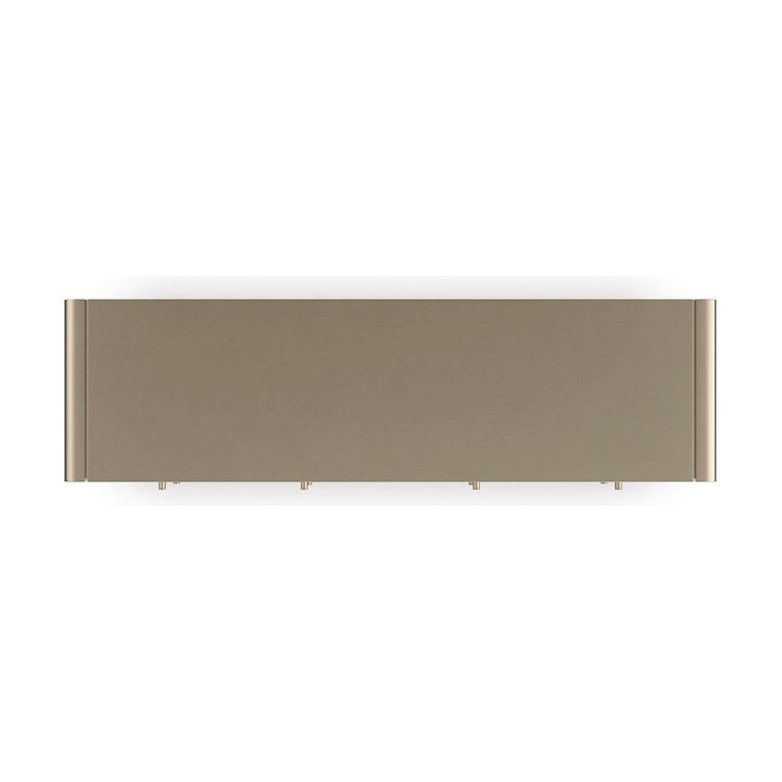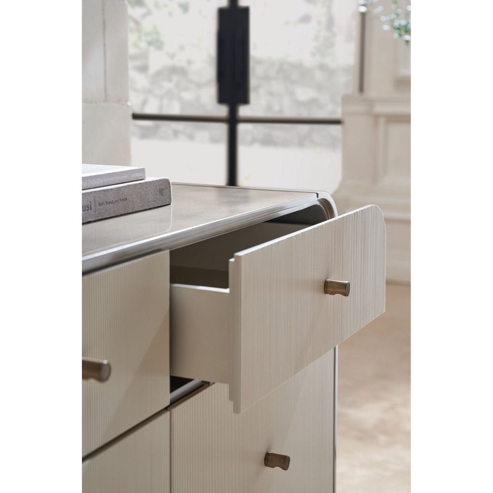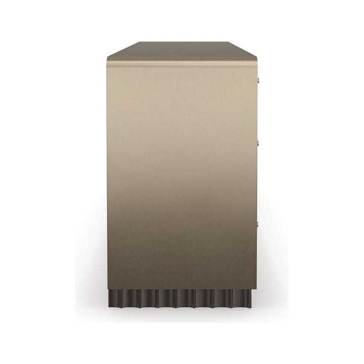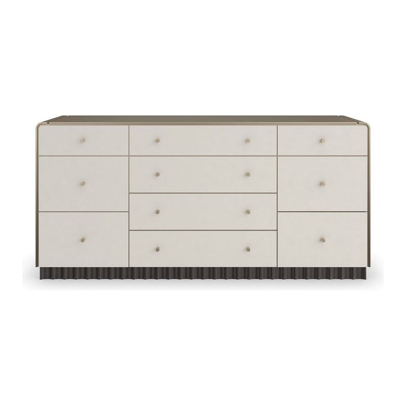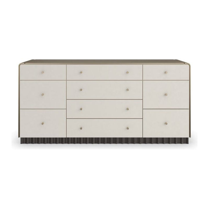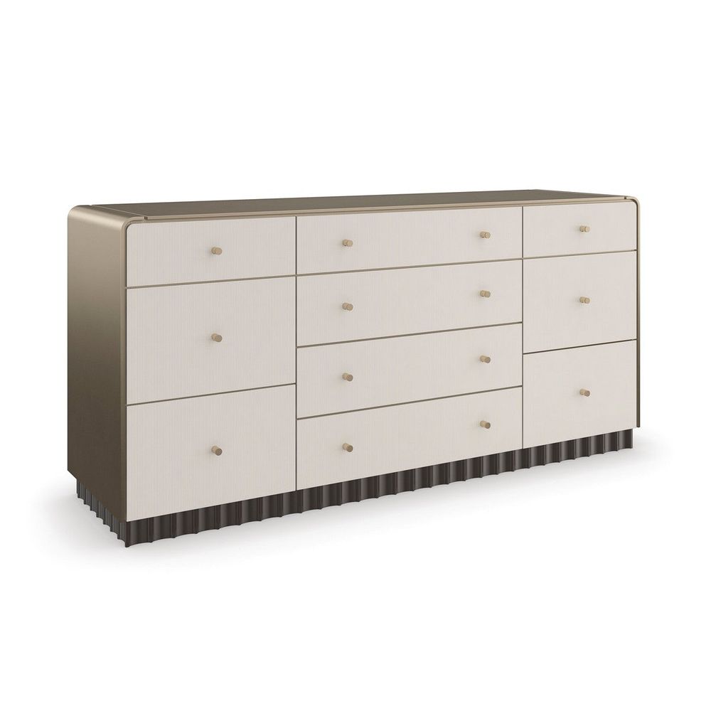 With a nod to neoclassical architecture, this clean-lined dresser introduces a gentle rhythm and geometric pattern to bedroom interiors. Micro-fluted drawer fronts add tactile appeal, punctuated by an exaggerated fluted base in a richly contrasting, Dark Chocolate finish. A waterfall top lends an elegant curve, finished in a Whisper of Gold paint for durability, warmth and a luxe touch. Minimal hardware compliments metallic accents and keeps the look serene.