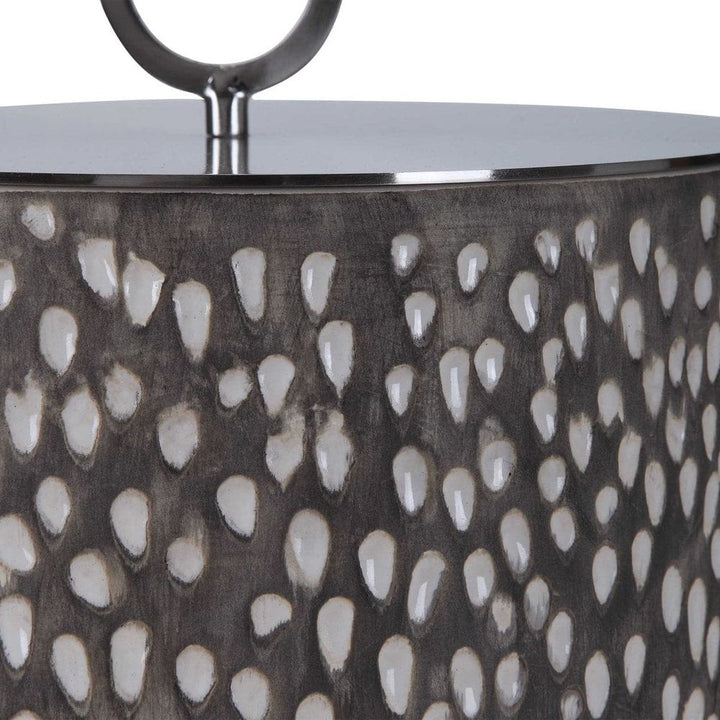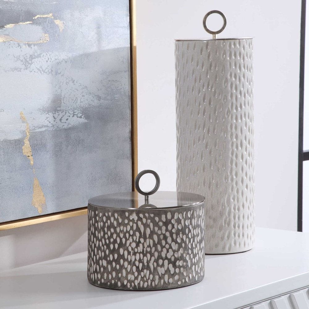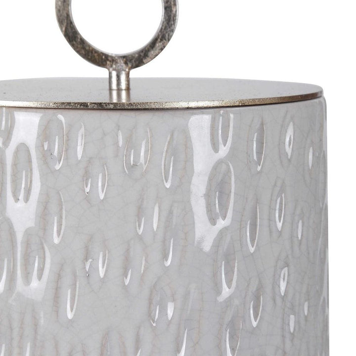 Ceramic containers feature carved detailing and are finished in off-white and smoke gray crackle glazes with respective aged gold and brushed nickel finished lids. Sizes: S-9x9x9, L-6x19x6
