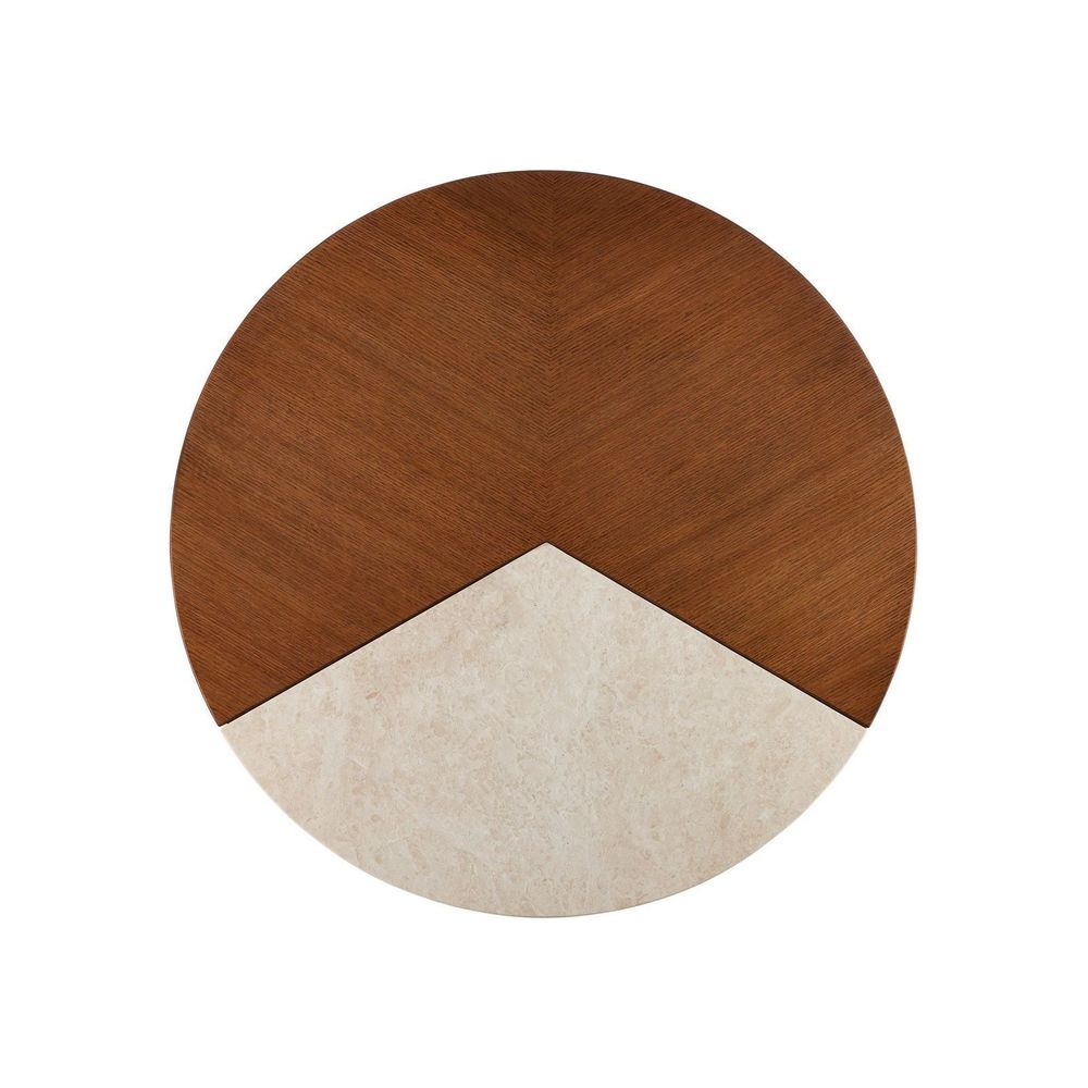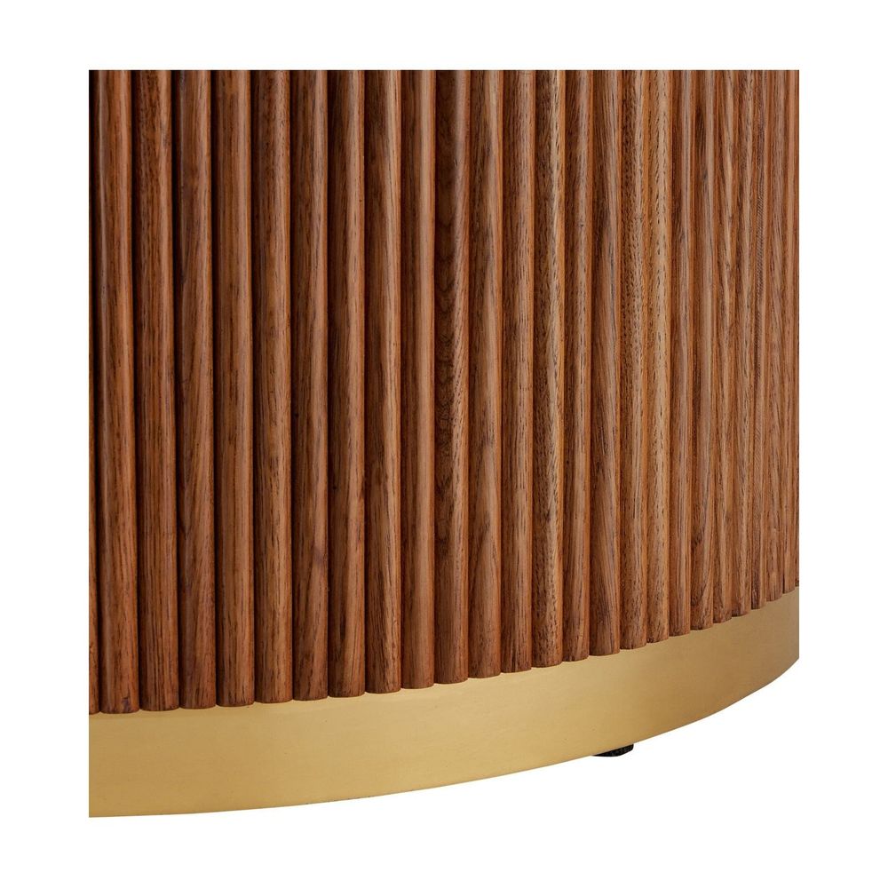 Description: The Dakota Large Cocktail Table has a reeded pedestal base made of solid oak with a brass plinth at the bottom. The oak veneer top has a slice of Crema Marfil marble wedged into it. Fine chamfers seam the two materials as a nice detail that Aimee Kurzner brought to this mid-century-modern inspired design.