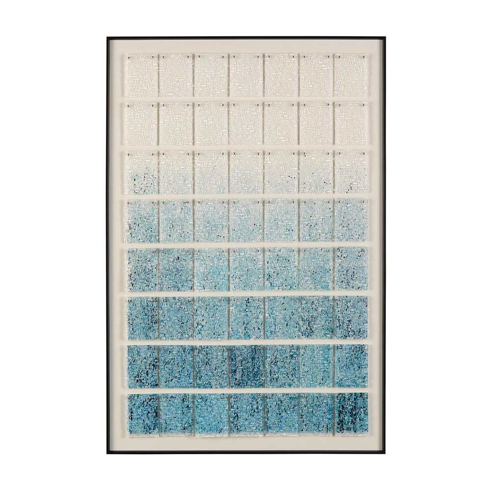 Cascading acrylic panels gradually fade from textured translucent white to cobalt blue shades in this original art by Daniel Fey. It is mounted in a black metal frame.