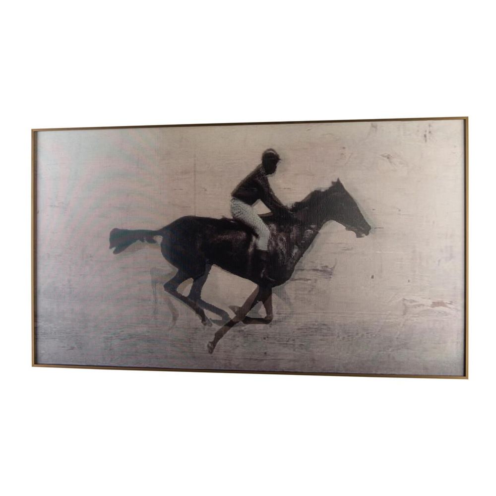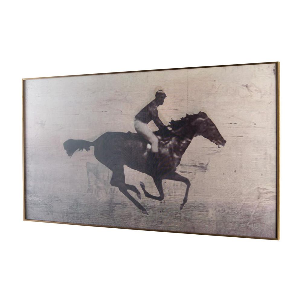 Race to the Finish by artist Daniel Fey showcases the stunning, rasterized image of a jockey on his racehorse represented in three separate images over a gray background. Based on the viewing angle, the horse can be seen in various positions mid-gallop, giving the illusion of motion within an interior space. A slender metal frame in an antique brass finish beautifully complements the artworks vintage look and feel.