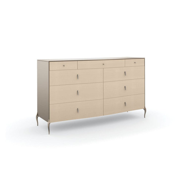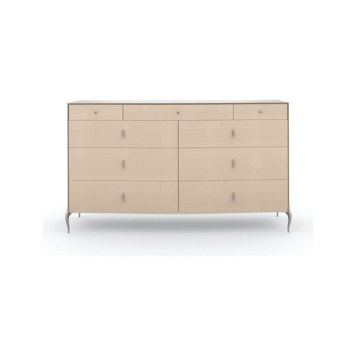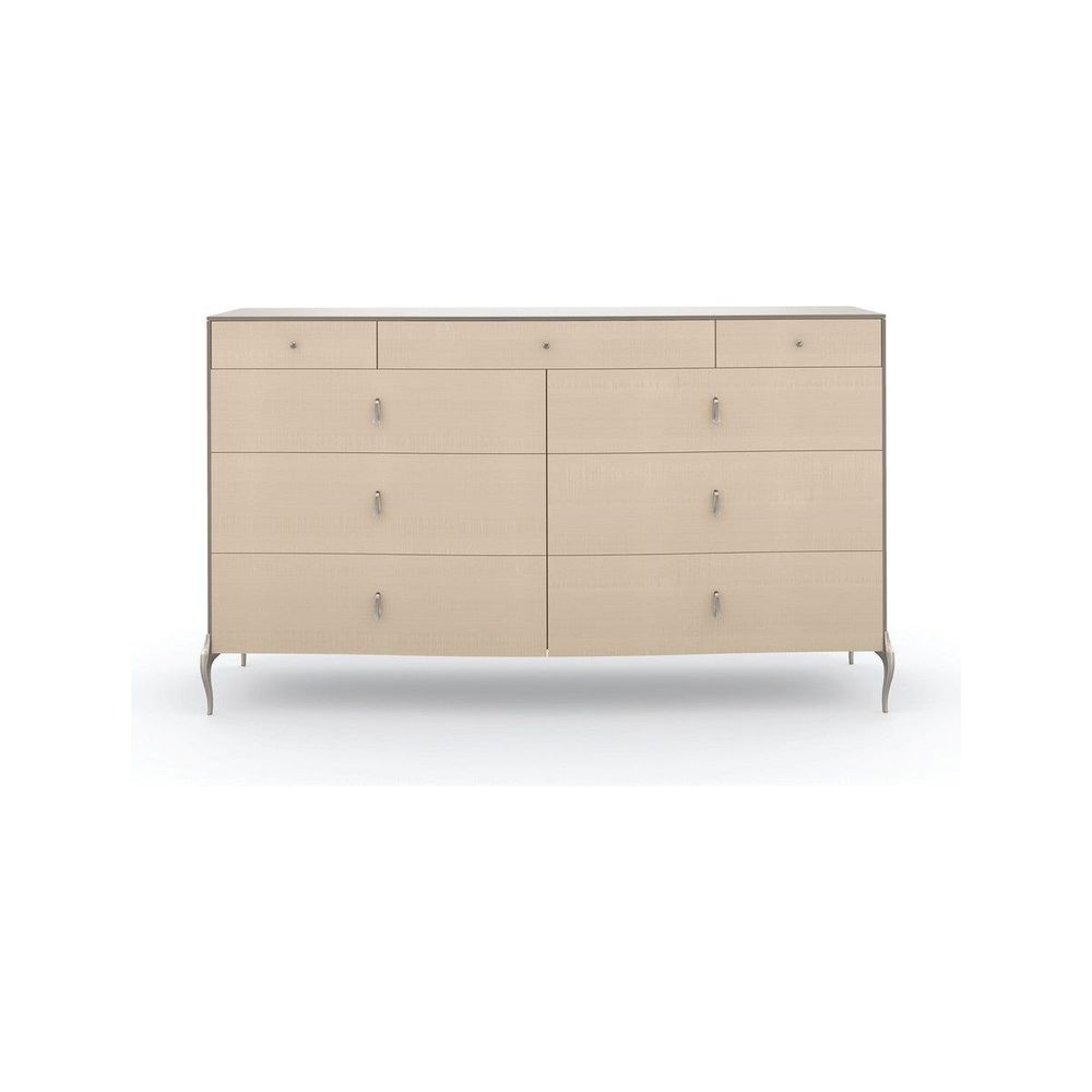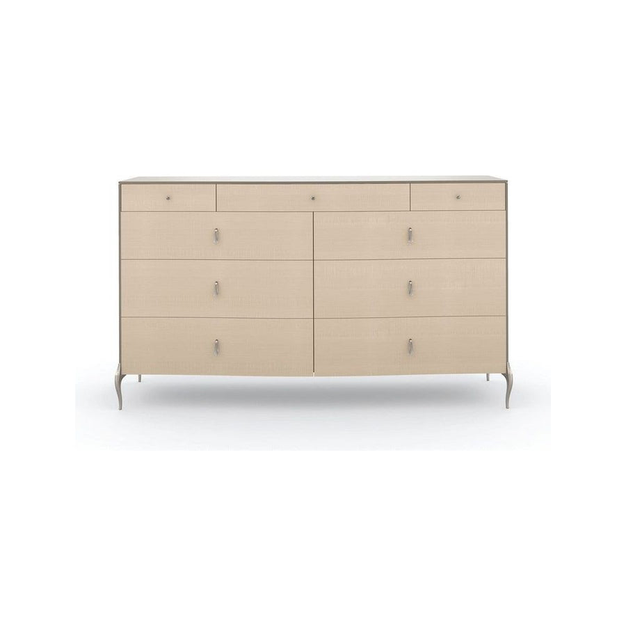 Poised to make an elegant first impression, this generous dresser introduces a refined mix of natural materials, with soft color palettes and a shimmering silver finish. Features nine soft-close drawers with fronts in Vanilla Cream, a soothing contemporary finish that brings to light the decorative character of figured sycamore. Elongated drawer pulls, inspired by an Art Deco jewelry pendant with a faux stone center, add a touch of grace. Ornate metal legs mimic flowing lines and a subtly curved top in Soft Silver Paint. Two felt-lined drawers on the top left and right add a note of luxury to intricately painted interiors.
