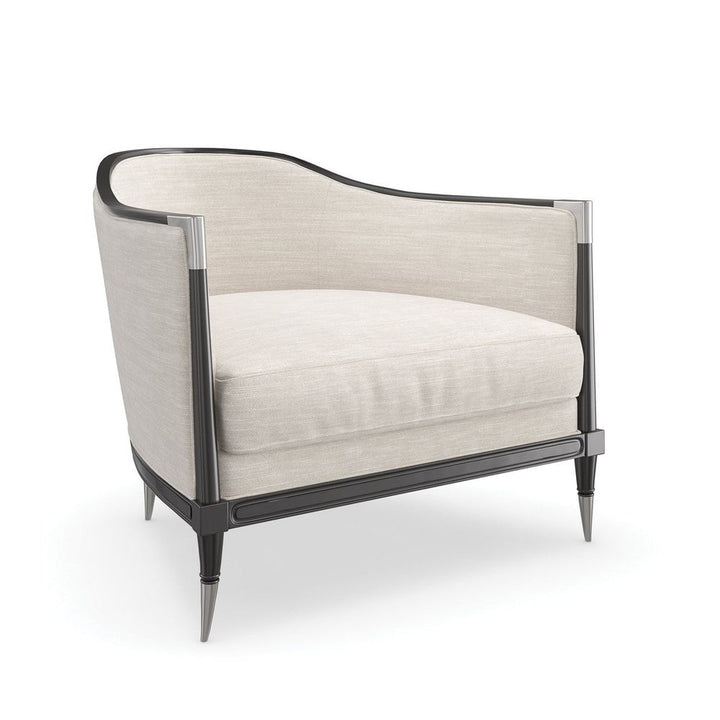 Tailored to perfection in an ivory linen woven fabric, this fresh take on a classic design features a softly curved silhouette dramatically defined by an Almost Black finish. Delicate metal ferrules and knuckles on the front arms draw their inspiration from an antique Italian parlor chair. The essence of sophistication, this chair blends seamlessly with a spectrum of styles.