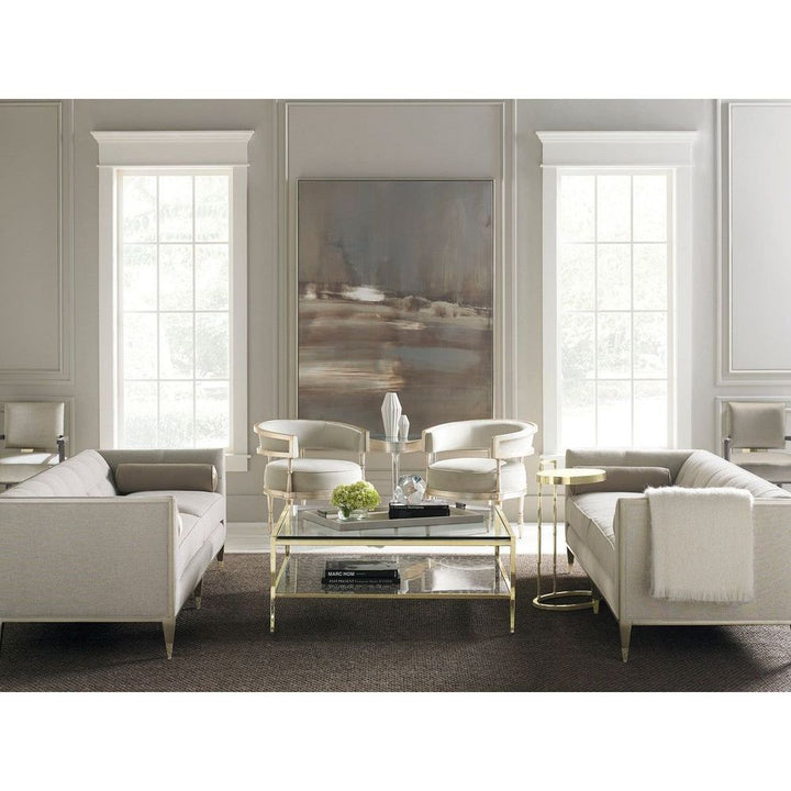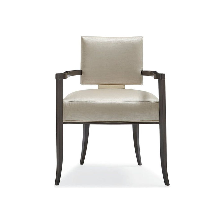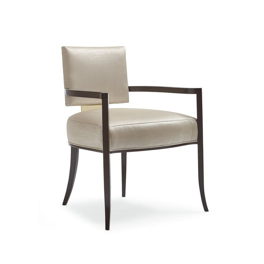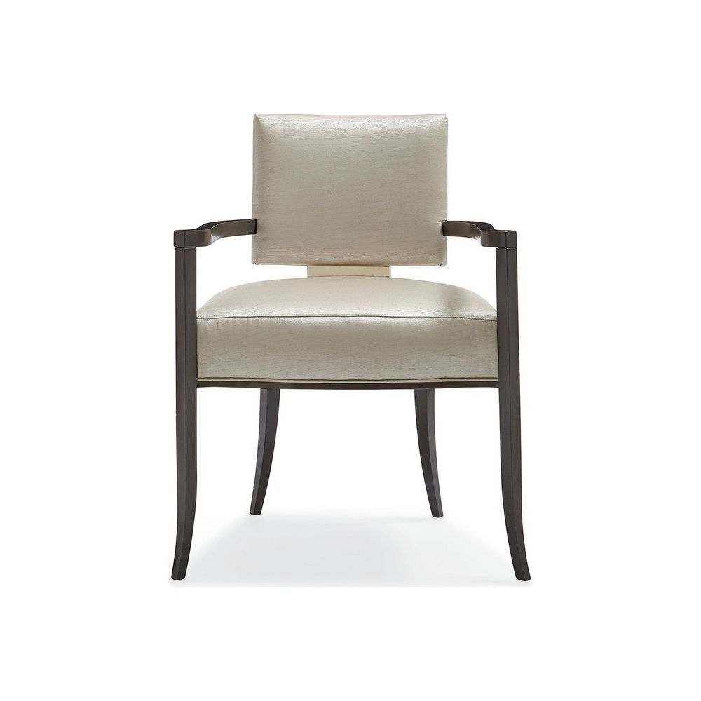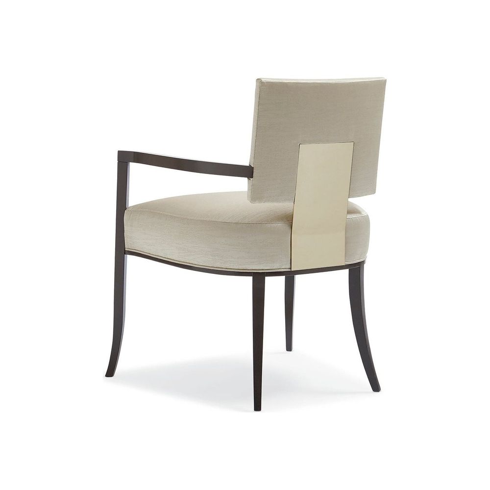 This contemporary arm chair takes on dramatic style when you view the wide, Whisper of Gold panel that shines off its back. Neutral sateen fabric with a subtle moire pattern fully surrounds the square upper back and seat cushion that rest on an exposed wood frame, sabre legs and gracefully curving arms finished in Seal Skin. This is a low, klismos chair with truly polished appeal.