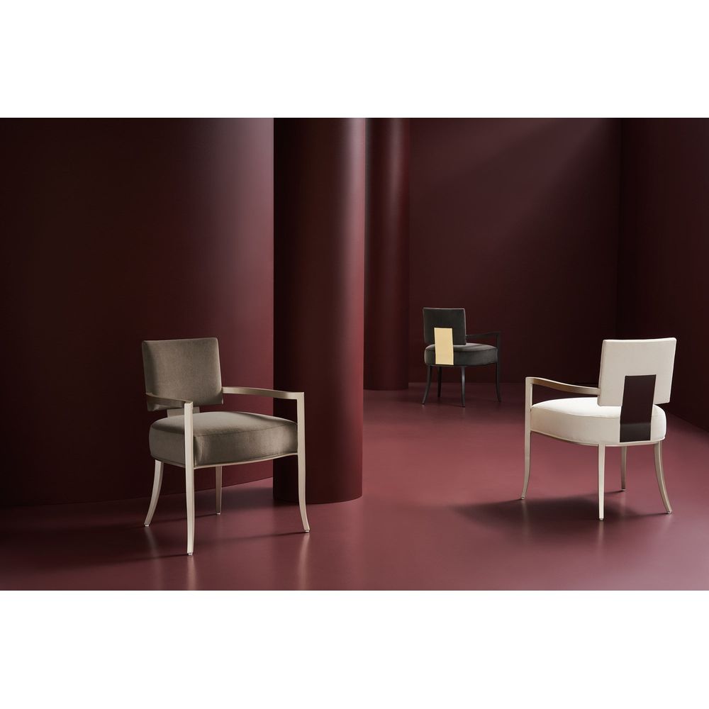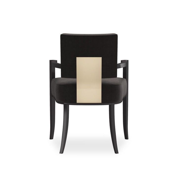 This contemporary arm chair takes on dramatic style when you view the wide, Whisper of Gold panel that shines off its back. Neutral fabric fully surrounds the square upper back and seat cushion that rest on an exposed wood frame, sabre legs and gracefully curving arms finished in Seal Skin. This is a low, klismos chair with truly polished appeal.