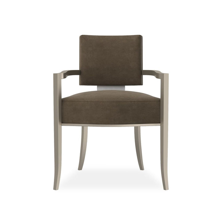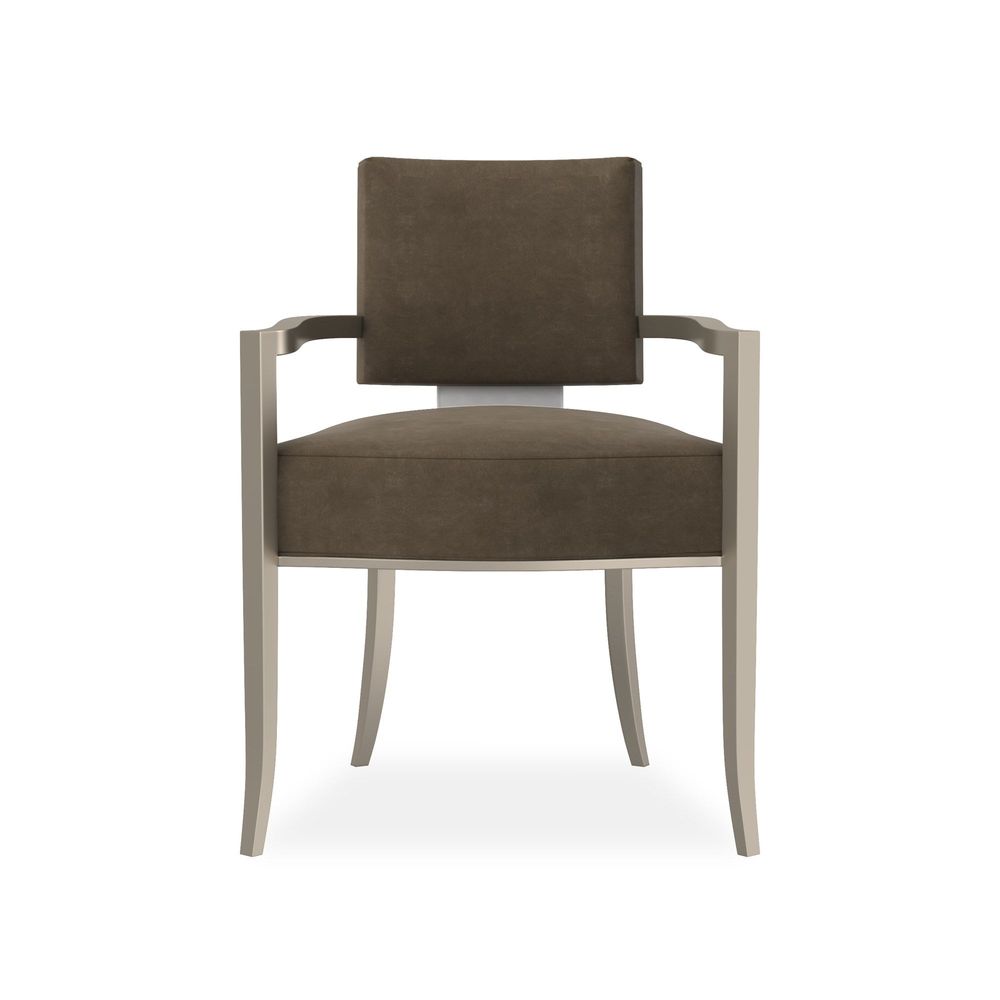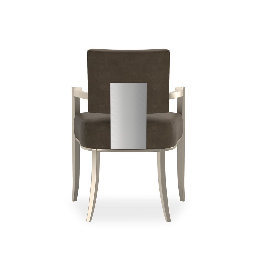 This contemporary arm chair takes on dramatic style when you view the wide, Lightly Brushed Chrome panel that shines off its back. Neutral fabric fully surrounds the square upper back and seat cushion that rest on an exposed wood frame, sabre legs and gracefully curving arms finished in Soft Silver Paint. This is a low, klismos chair with truly polished appeal.