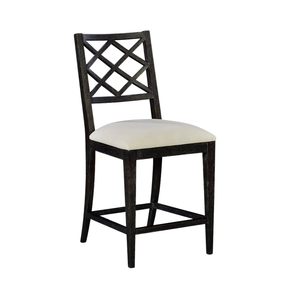 Diamond back counter chair, smooth clean diamond pattern on curved back, tapered legs, metal foot rail.