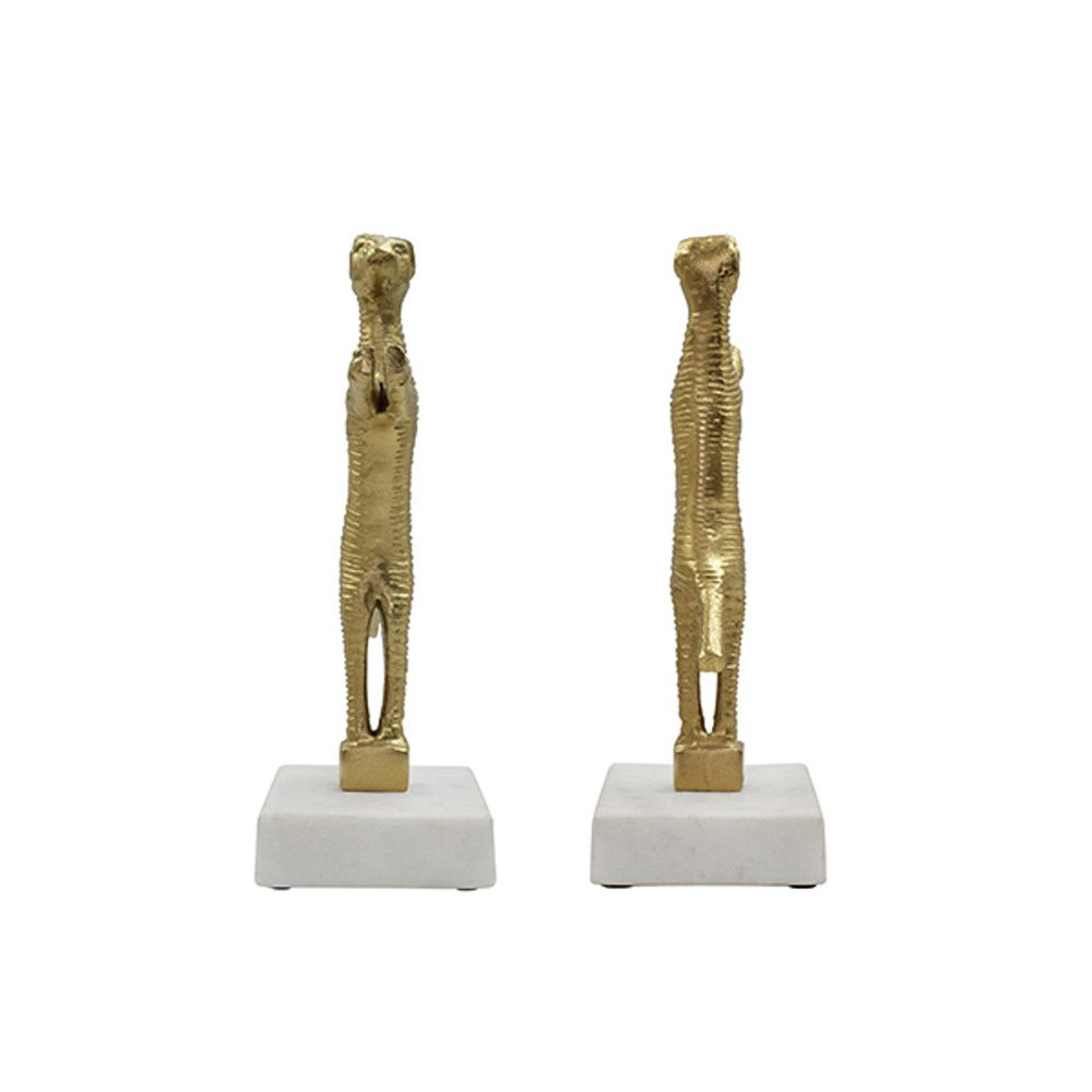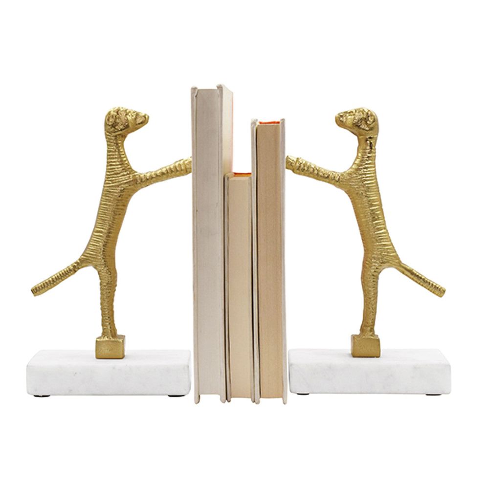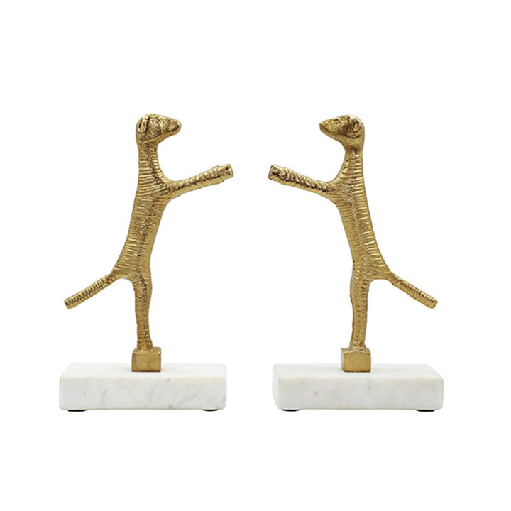 Description: PAIR OF DOG BOOKENDS IN BRASS FINISH ON WHITE MARBLE BASE *Marble is a natural stone and will vary slightly in color, pattern, and veining.