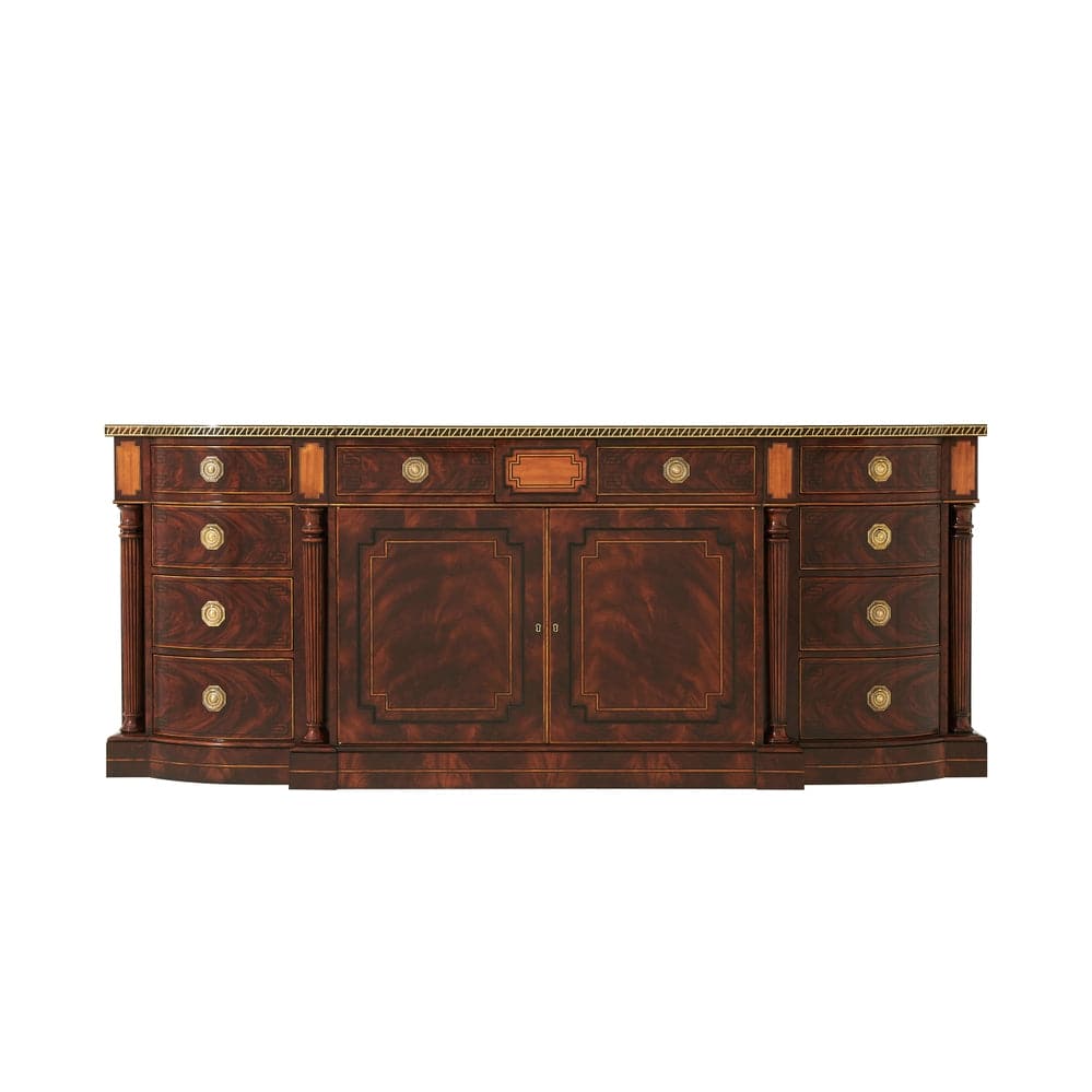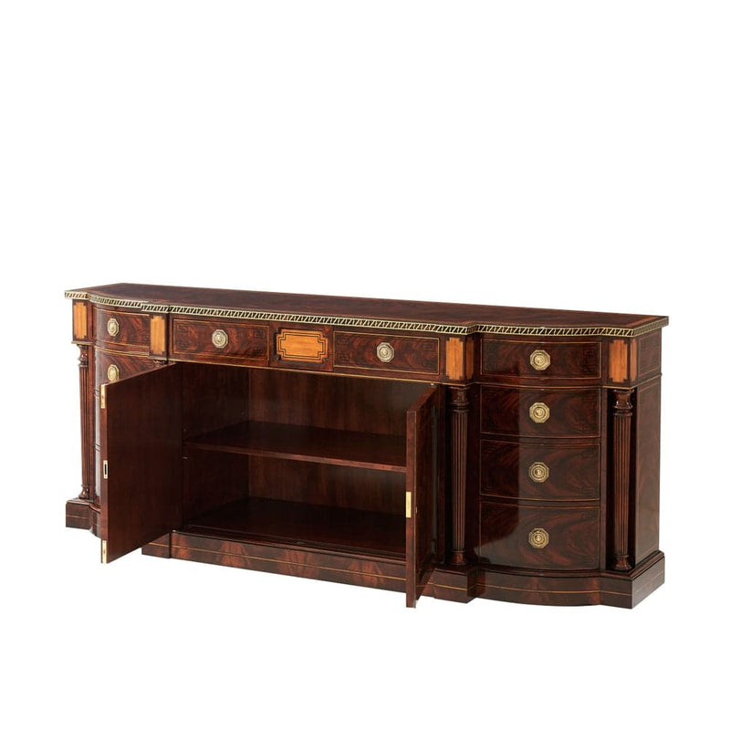 A fine mahogany veneered and yew burl banded buffet, the break bowfront top with an ebony and brass inlaid edge, above an arrangement of four frieze drawers and central cabinet doors enclosing an adjustable shelf, flanked by two sets of three graduated drawers and turned and tapering columns, on line strung plinth base.