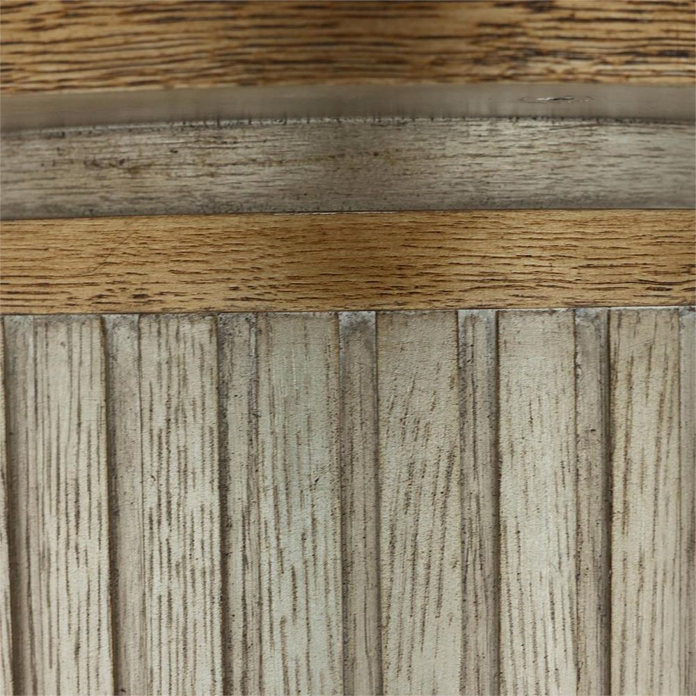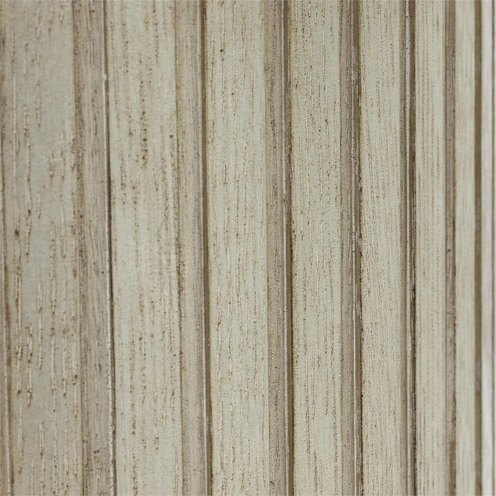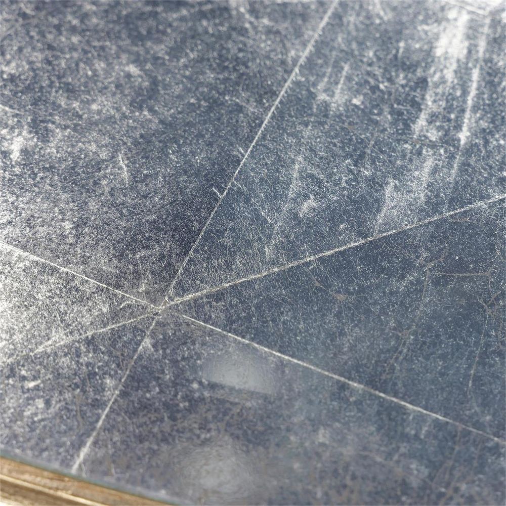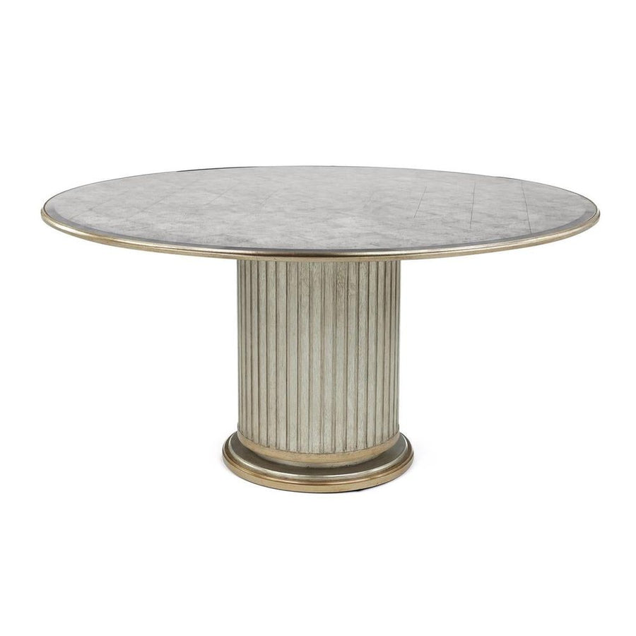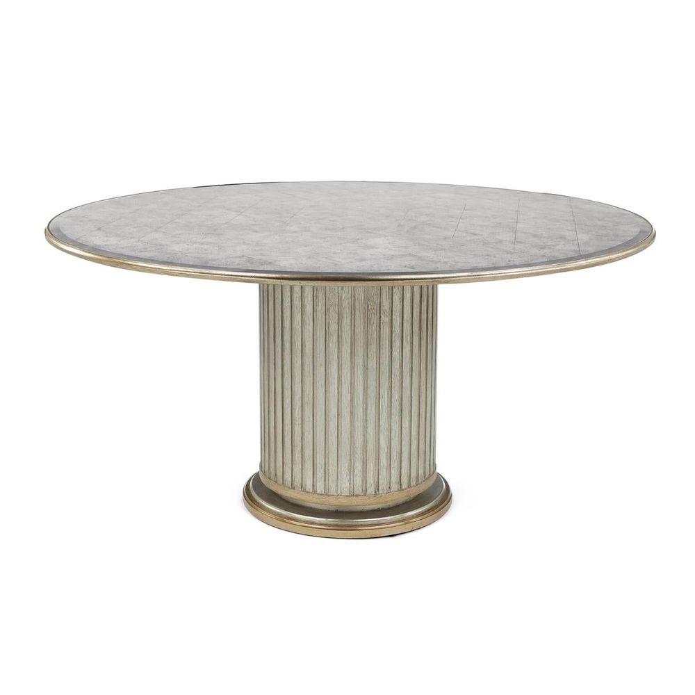 The Dorien Dining Table takes cues from ancient architecture, translating it through the lens of chic modern design. Crafted from oak wood, the ornate base is reminiscent of Doric Greek columns with a proud silhouette and subtle fluting. The column with steel fittings is finished in Silver White and accented with touches of Valyrian Gold, matching the rounded base and accent border of the tabletop. A large, beveled glass tabletop features stunning eglomise, providing contemporary charm to this classic look.