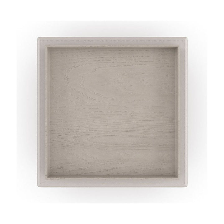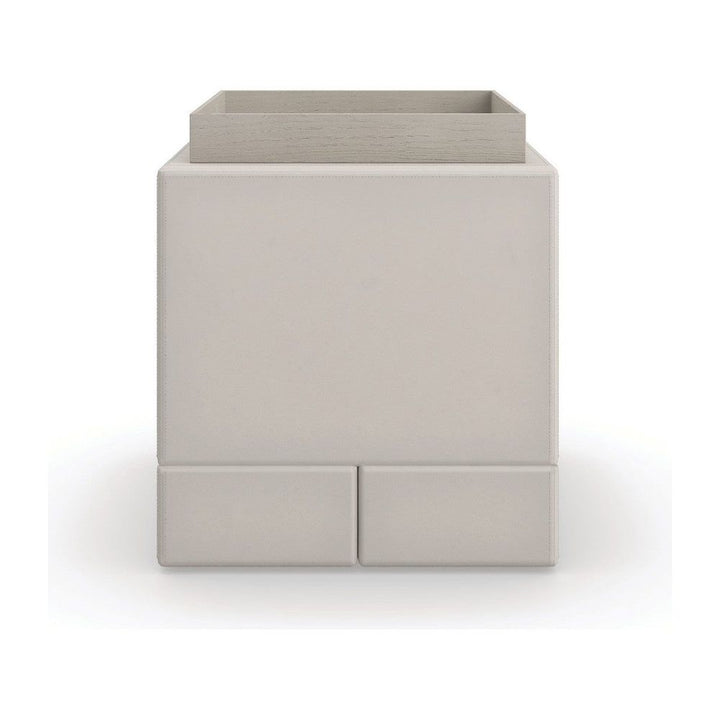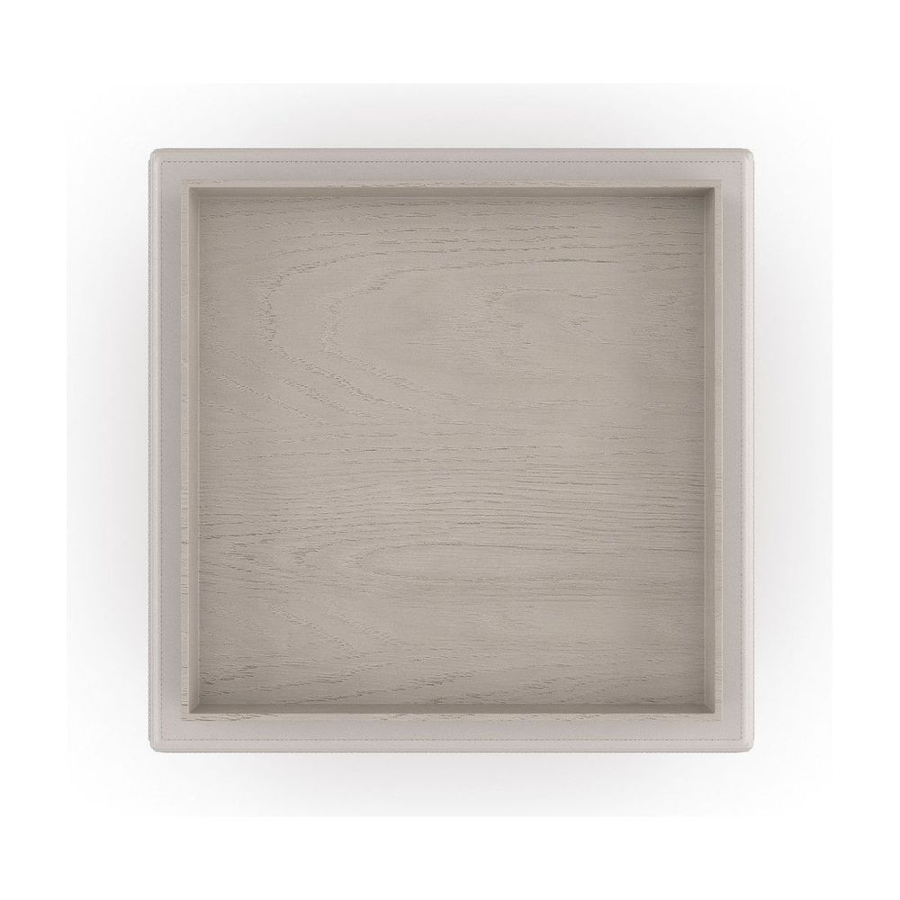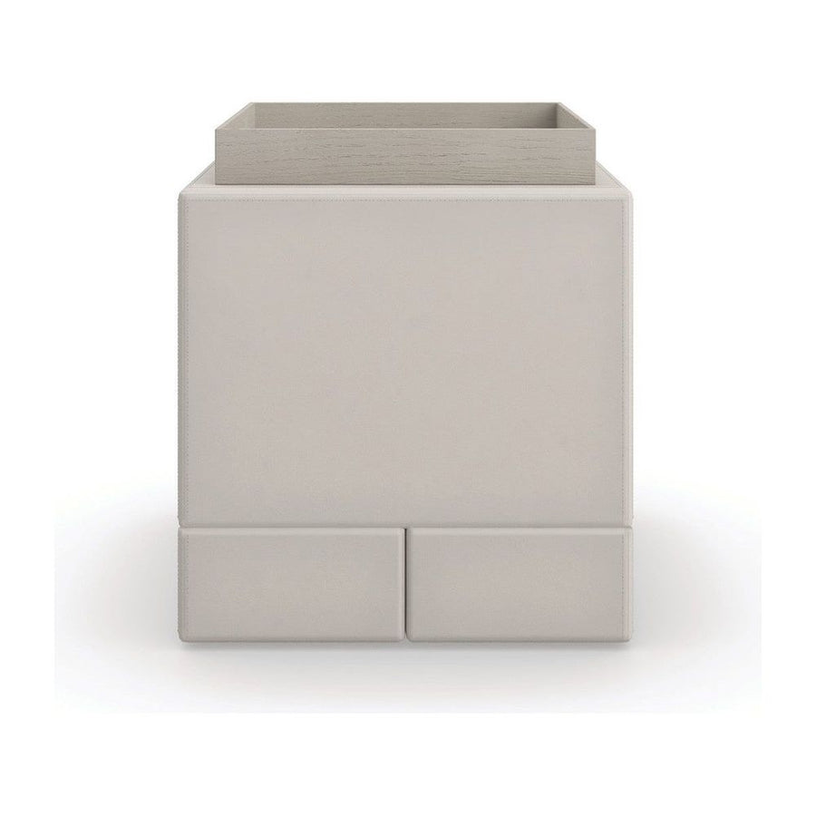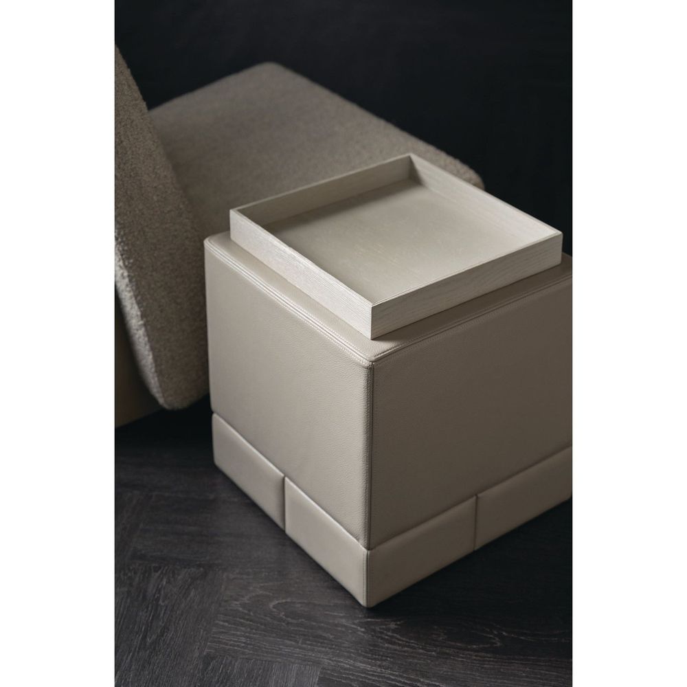 Double stitch details and gently rounded edges elevate the simplicity of the Bindi side table, crafted from stacked blocks in a luxurious taupe leather. Comes with its own elegant oak tray in a neutral Fossil finish for added function and an organic finishing touch.