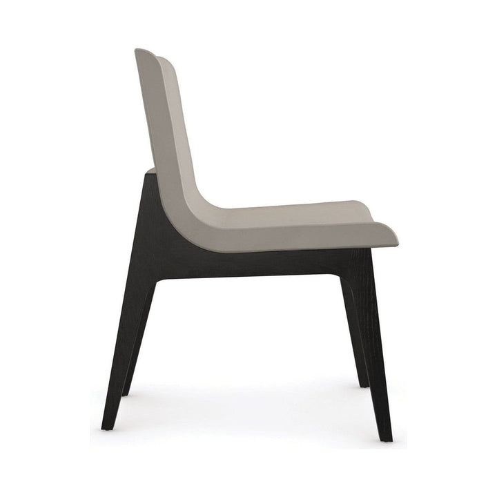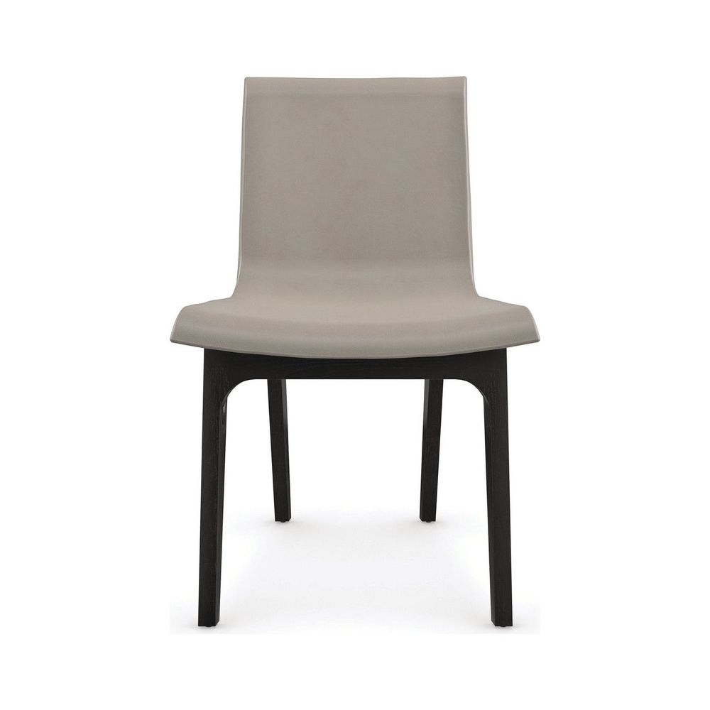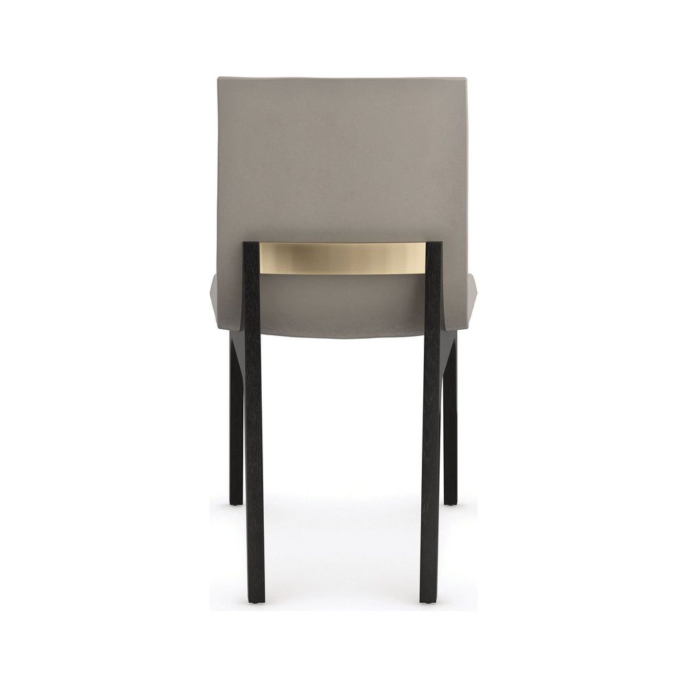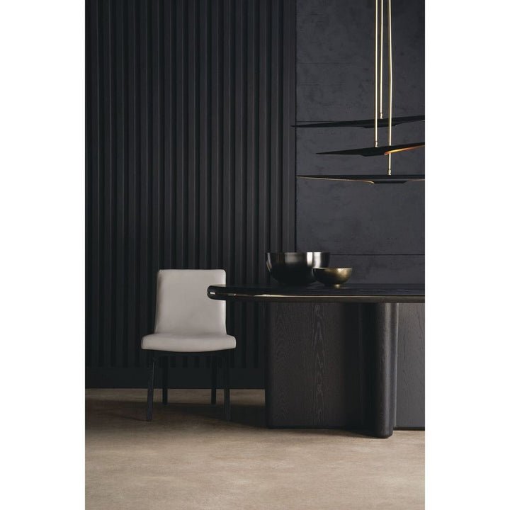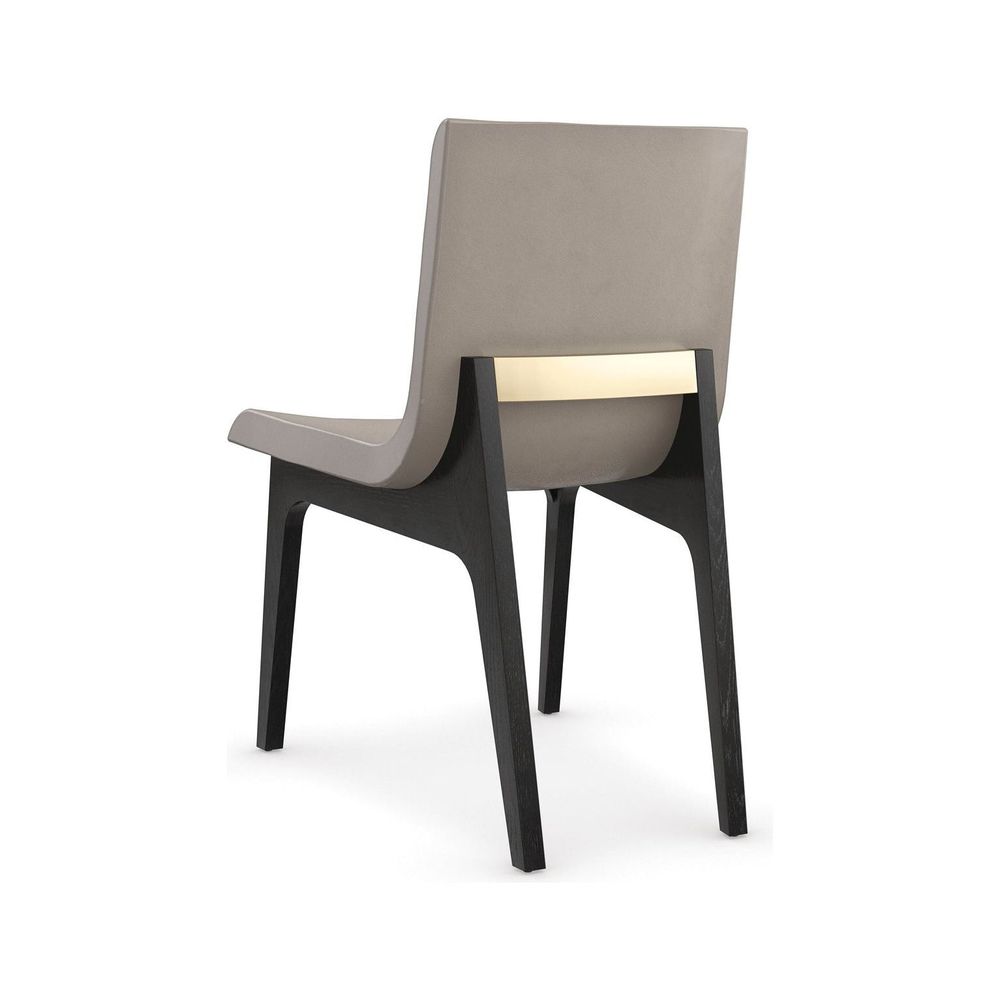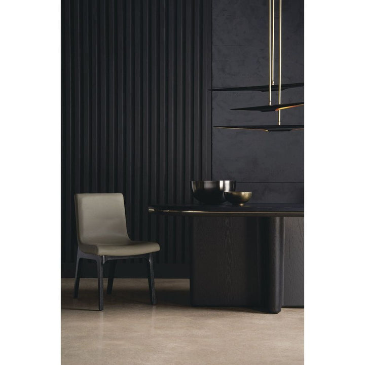 A masterful blend of luxury and comfort, the Starr dining chair introduces a simple yet elegant mix of textures and materials. Comfortably curved, Starr's seamless back and seat is dressed in taupe leather, contrasted by wood legs in a Basalt finish. A back bar detail adds warmth and hint of shimmer in Polished French Gold. Pairs perfectly with the Monty dining table.