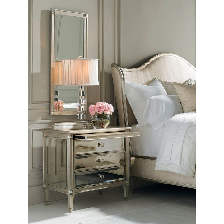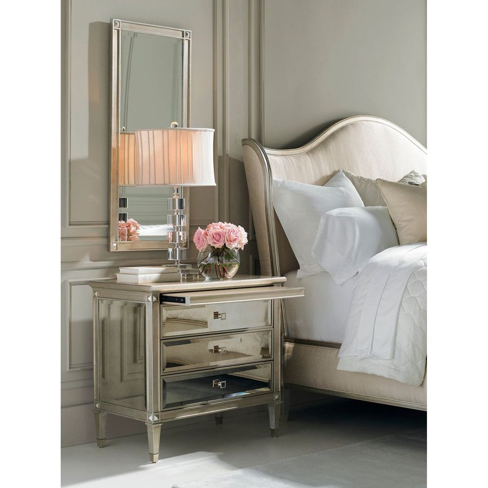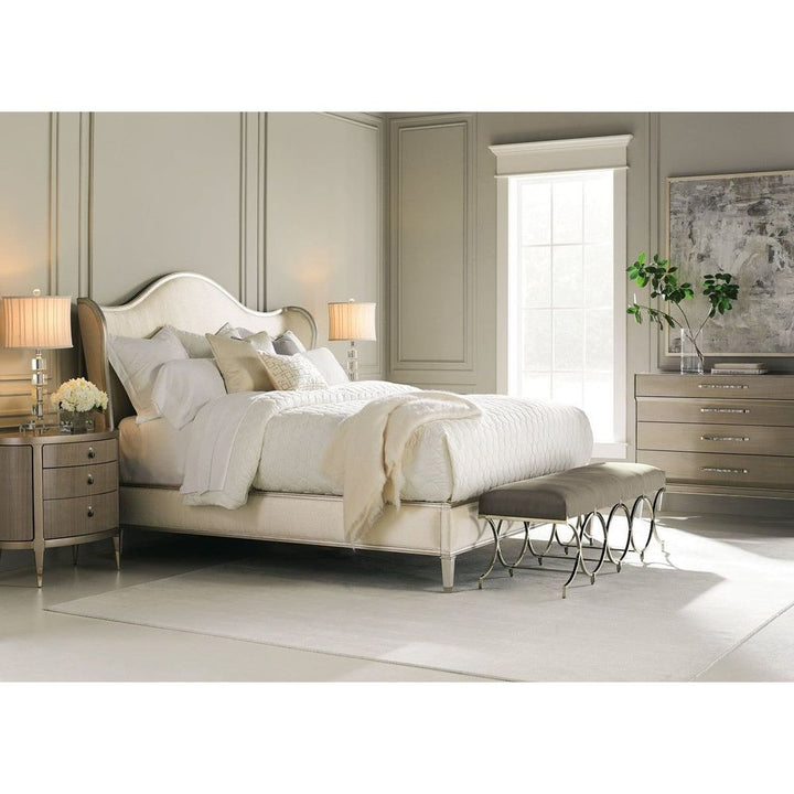 This Bedtime Beauty has a dramatically updated camel-back headboard with generous curving wings that give it regal style. The exposed exquisitely carved wood rail is finished in radiant Auric silver leaf. Fully upholstered in a cream strie fabric. This piece has a low footboard and square-tapered carved feet. Refined elegance never looked so comfortable.