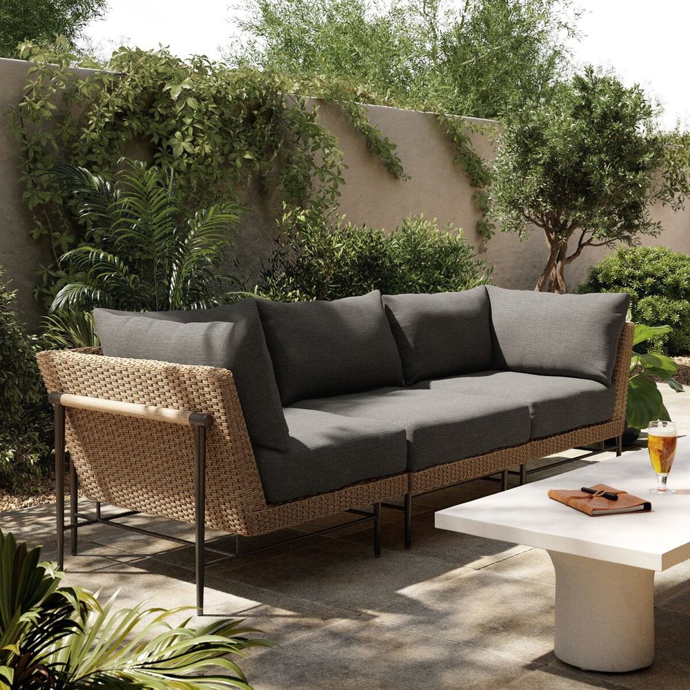 The ultimate outdoor lounger. Atop an airy, bronze-finished aluminum base with rear FSC-certified teak dowel detailing sits a woven layer of faux hyacinth, with weather and sun-resistant seating in an inviting charcoal. Corner piece to matching sectional. Cover or store inside during inclement weather and when not in use.