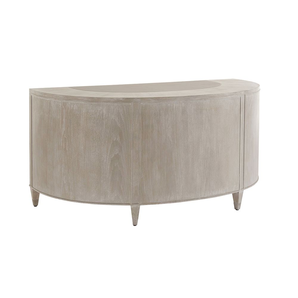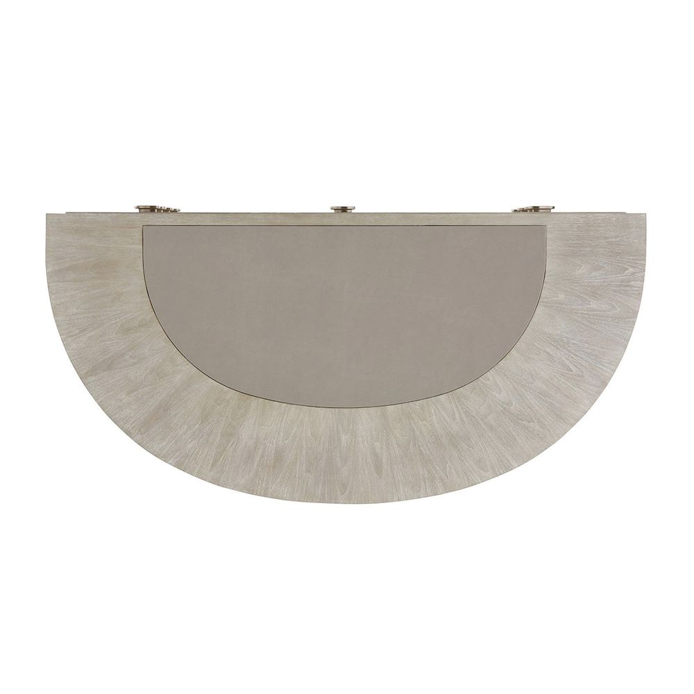 Feature 1: Making an exceptional design statement, the Dylan Demilune desk features a graceful curved front that showcases the cathedral grain patterns of Walnut veneer. The desk features seven storage drawers and one letter-sized file drawer. The arched writing surface on the top is an inset of correlated gray faux leather.