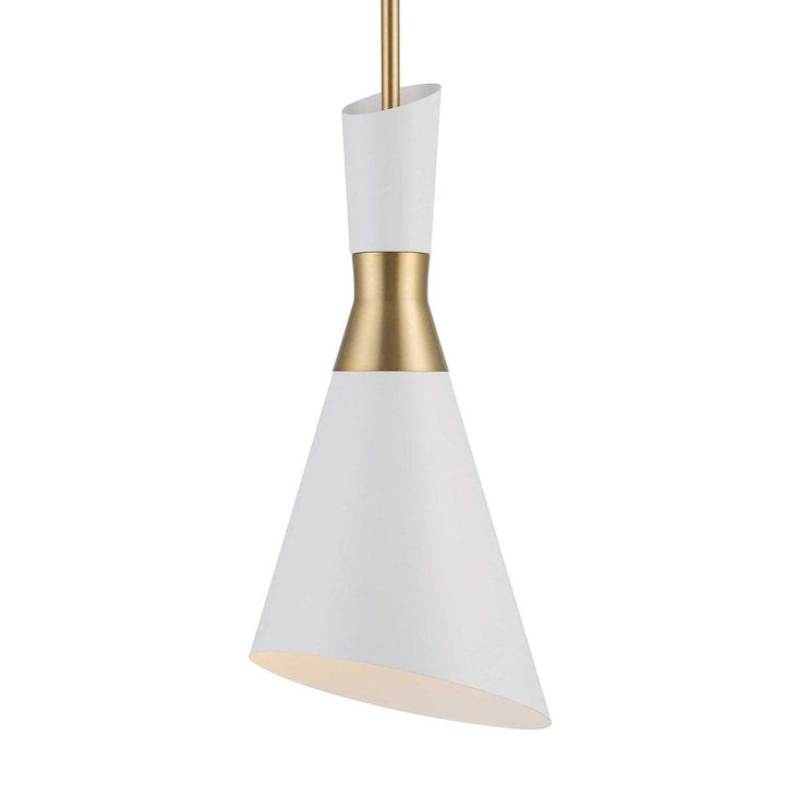 Modern lines & shapes in a White & Antique Brass finish with a retro feel give us a classic looking Mid-century cone pendant. 1-60 watt max Edison socket. Bulb not included. Supplied with 15' wire, 3-12" stems and 1-6" stem for adjustable installation.