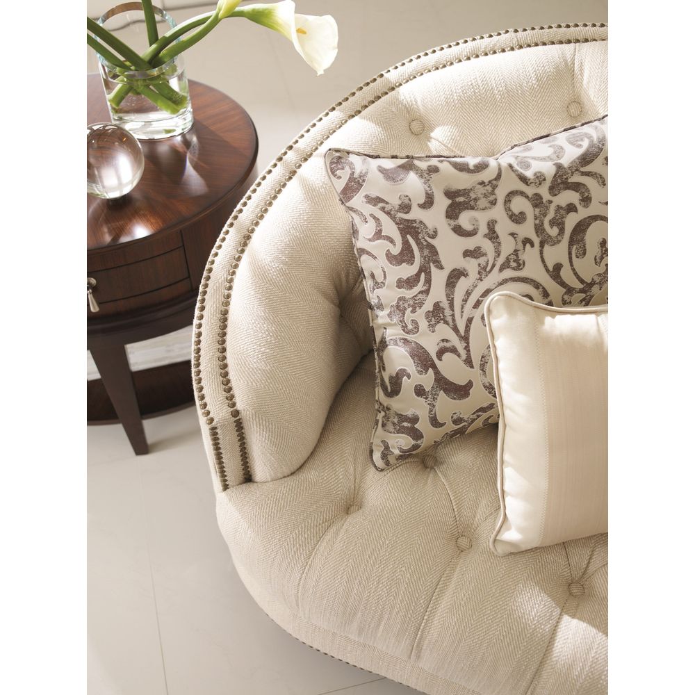 Curvaceous and shapely, with traditional elements like button-tufting and decorative nailhead trim, this bench seat sofa also conveys a modern sensibility covered in a subtle textured herringbone fabric, with metallic accents on the pillows. An antiqued metal ferrule caps the carved wood feet.