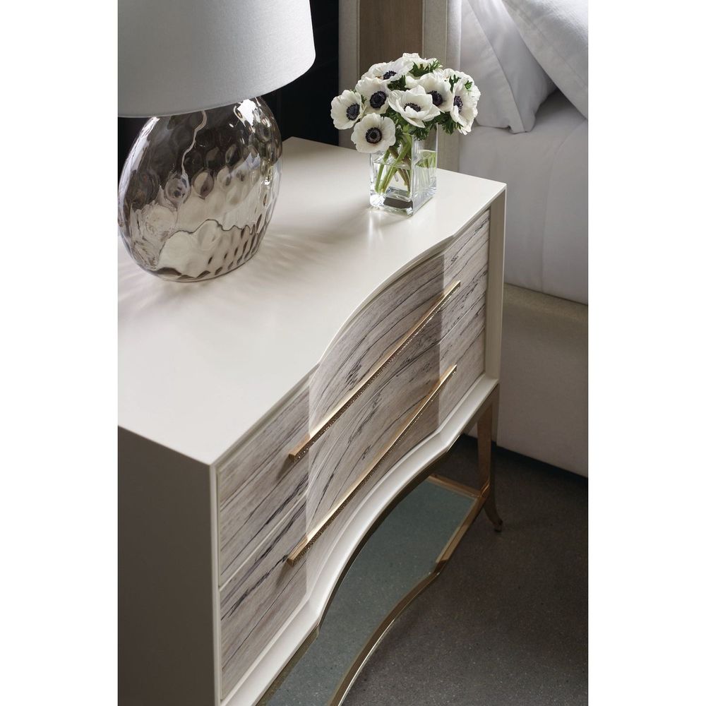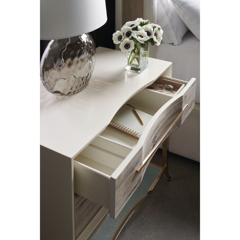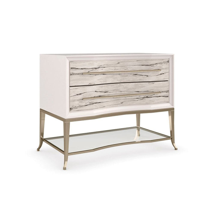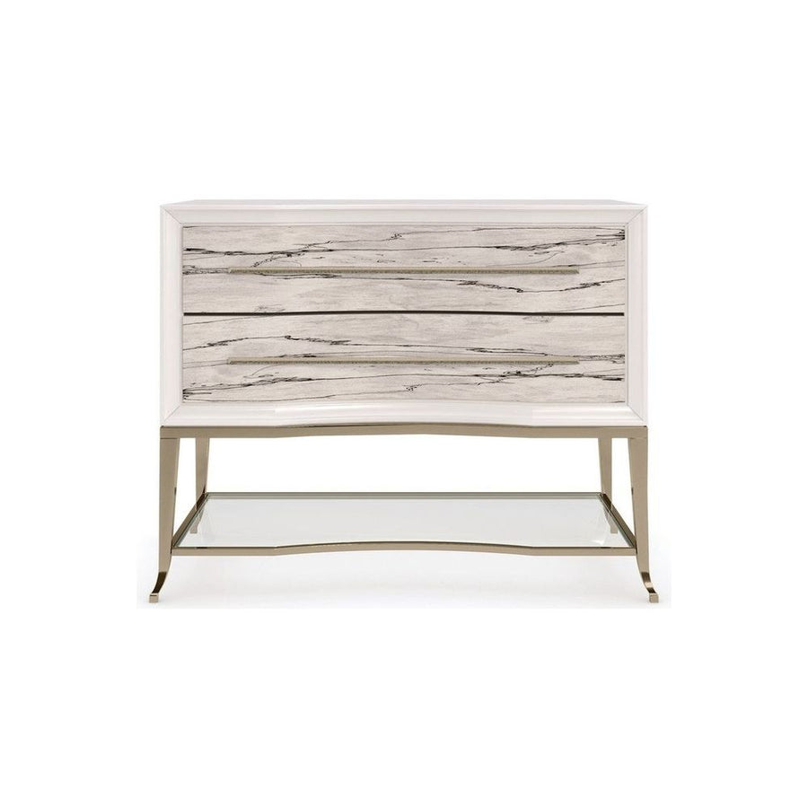 An elevated take on found beauty in the natural world, this nightstand introduces an organic element with a touch of luxe. Drawer fronts crafted in our exclusive, bleached white printed spalted maple add depth and dimension with dark veining patterns over a light ground reminiscent of fallen snow. Dimpled bar drawer pulls and a Majestic Gold base are a glamorous complement to its Pearly White finish, which pairs well with other pieces in our bedroom storage collection. Top drawer features dividers and a removable sliding jewelry tray, with a glass shelf beneath for open storage and display.