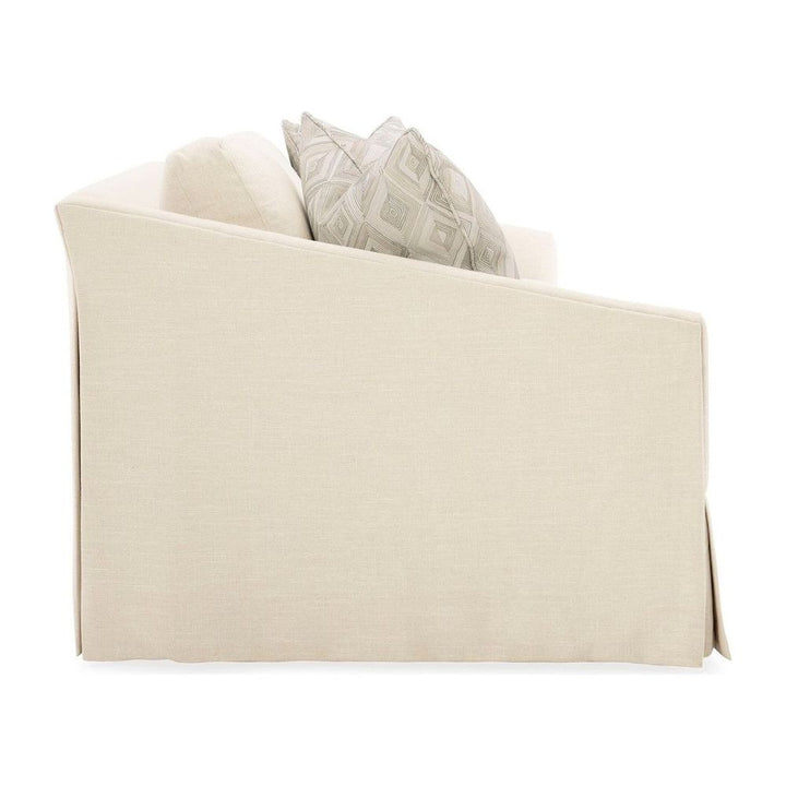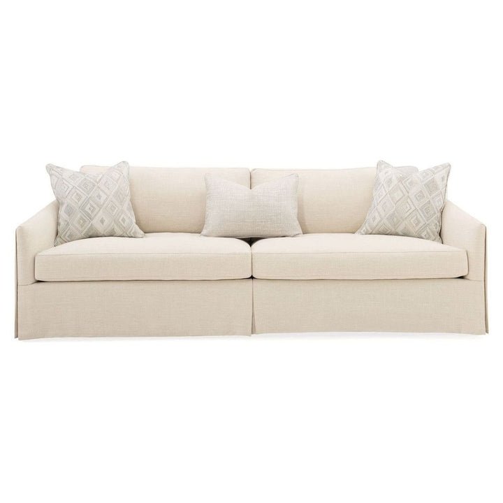 A Casual Affair illustrates how fashion informs home fashion. Drawing inspiration from the latest styles shown at NY Fashion Week, this captivating sofa showcases clean lines paired with a classic flow of draped material and layered pleats. Its sleek sloped arms feature a dressmaker skirt that falls open from the top of the arm front and back. Luxuriously soft, neutral accent pillows add a touch of tonal pattern. Relaxed, refreshed, and ever so classic, this sofa is a foundation piece for fine design.