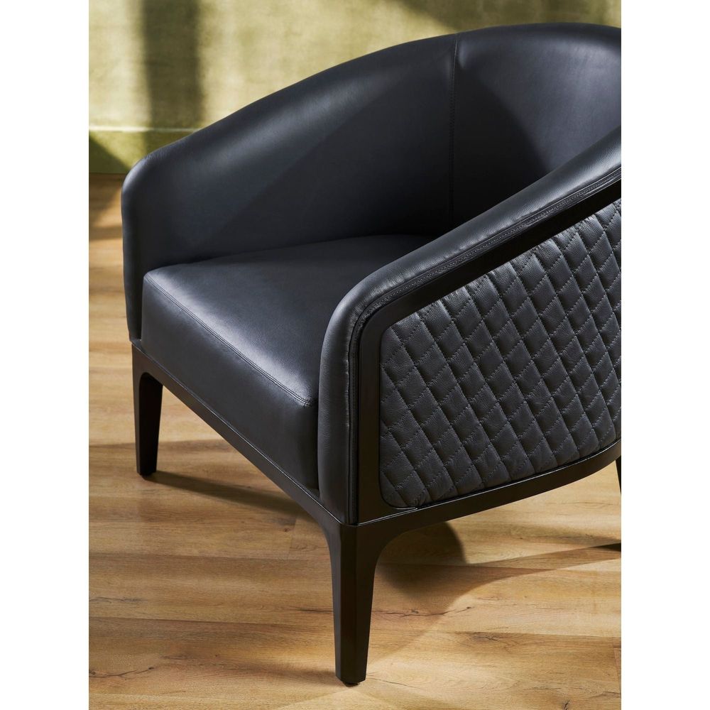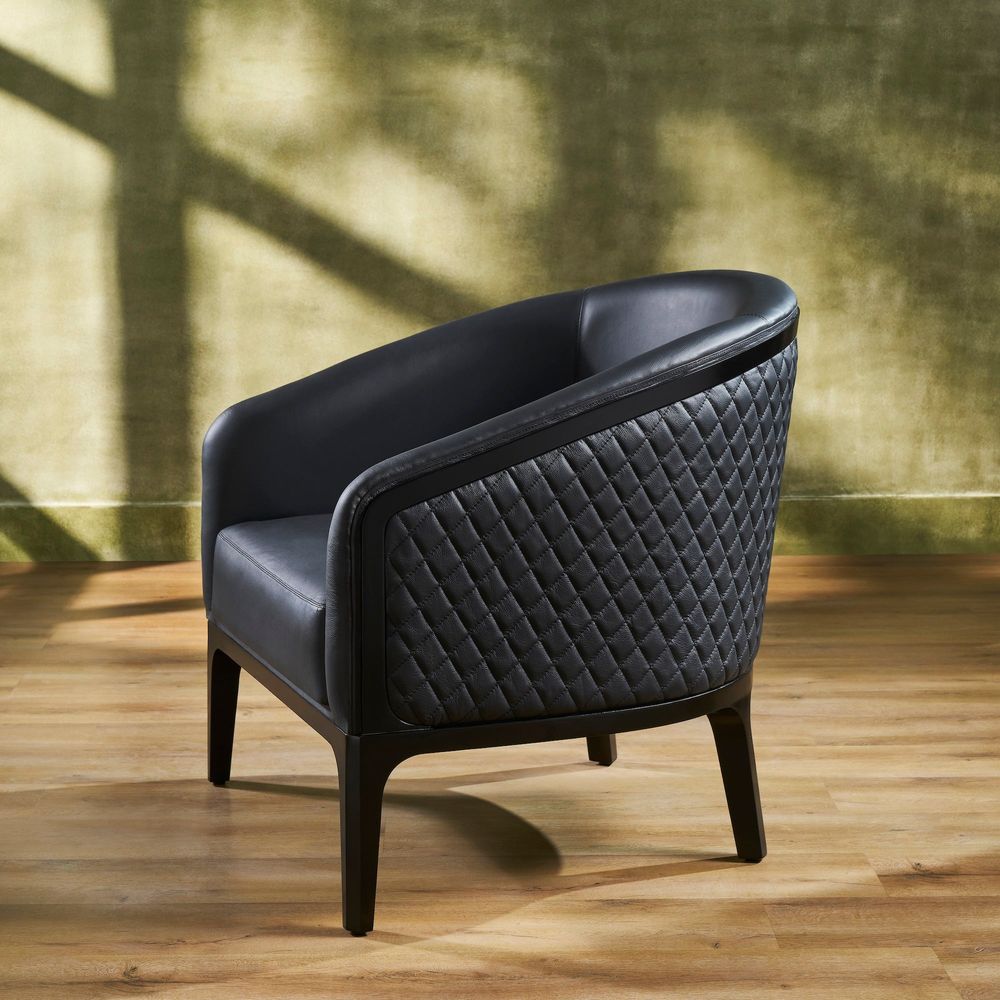 Description: Sit back and relax in our Edward Leather Lounge Chair, which exudes minimalist glamour. The chair's pretty and unforgettable allure is impossible to miss. The silhouette is distinguished by a shaped, open back, while the leather upholstery adds another level of refinement. The luxurious top grain leather covers the chair, and the outside seat back is upholstered with a diamond quilting pattern. Place it in a room where you can admire it from every angle and appreciate its minimalist glamour.