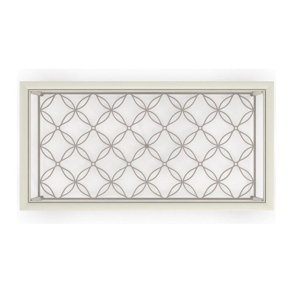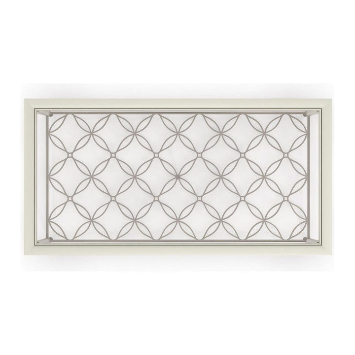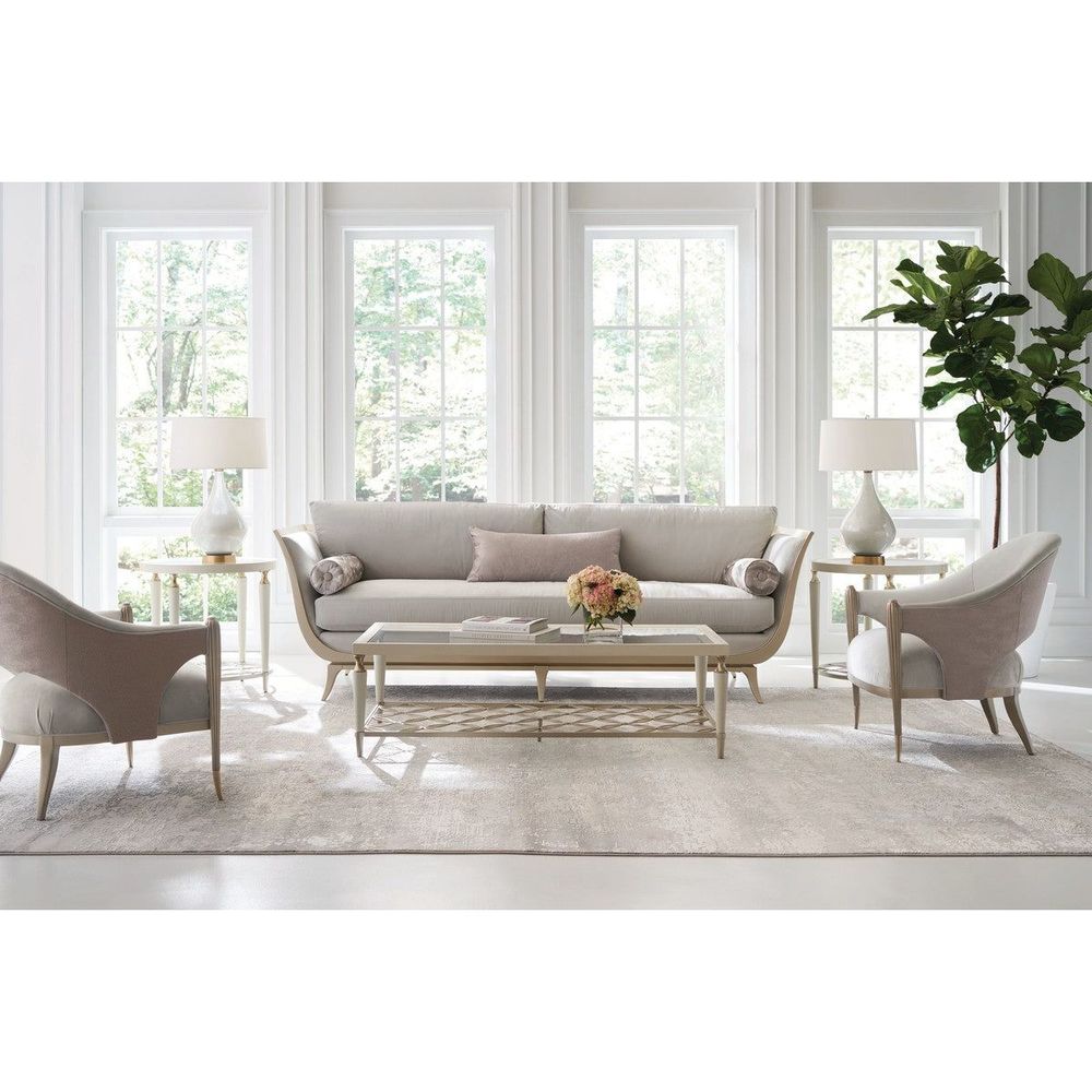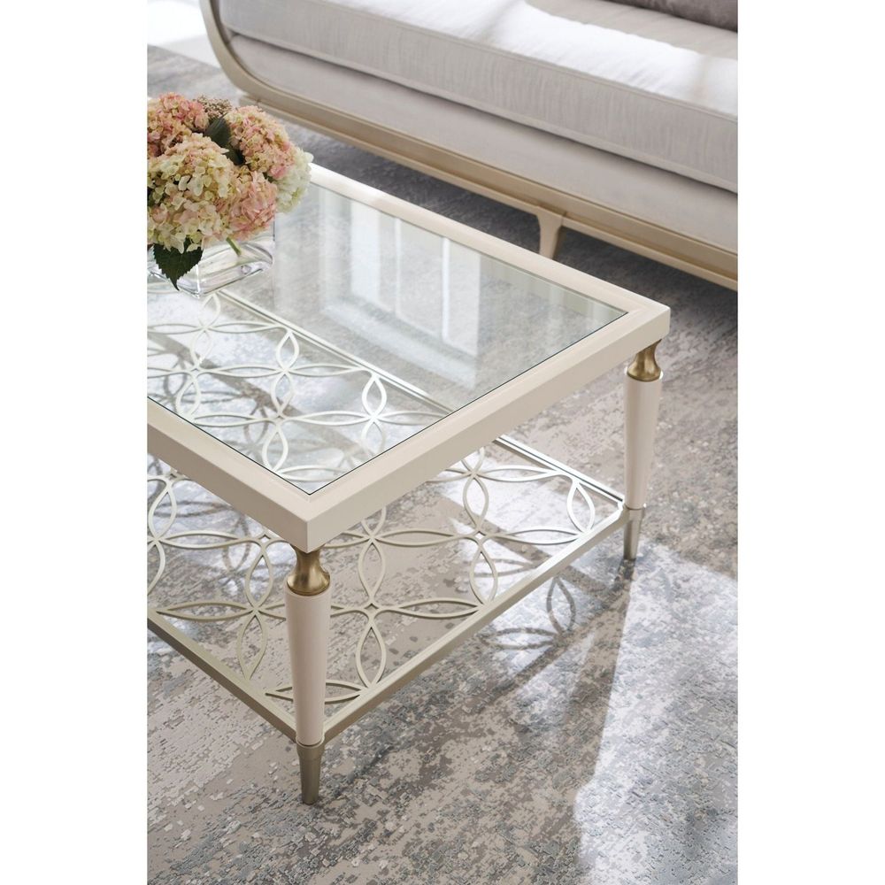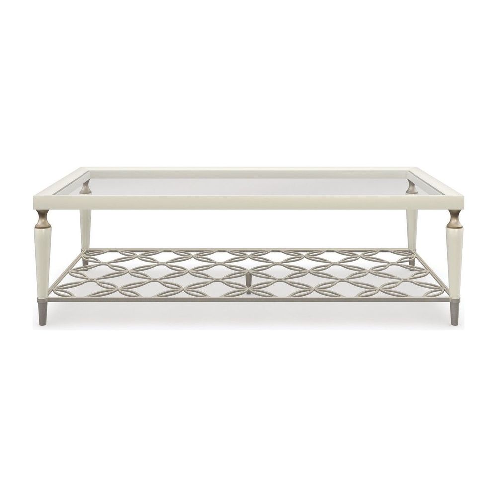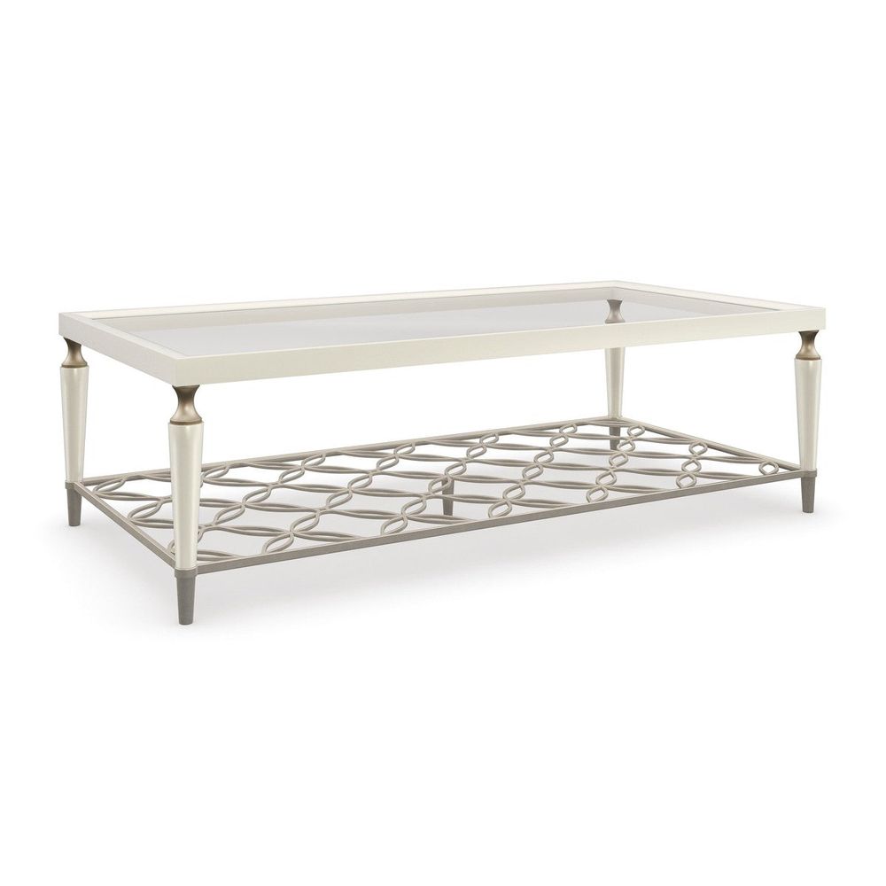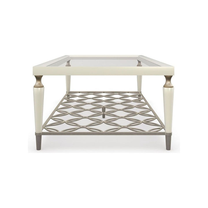 Classic and of the moment, this cocktail table effortlessly grounds the room and makes an unforgettable statement. An open fretwork metal shelf lends a striking view, glimpsed beneath its clear glass top, set within a Creme de la Creme painted wood frame. Turned legs add an elegant detail, defined by metal ferrules and a Gold Bullion Leaf decorative collar. Part of a five-piece offering in occasional tables