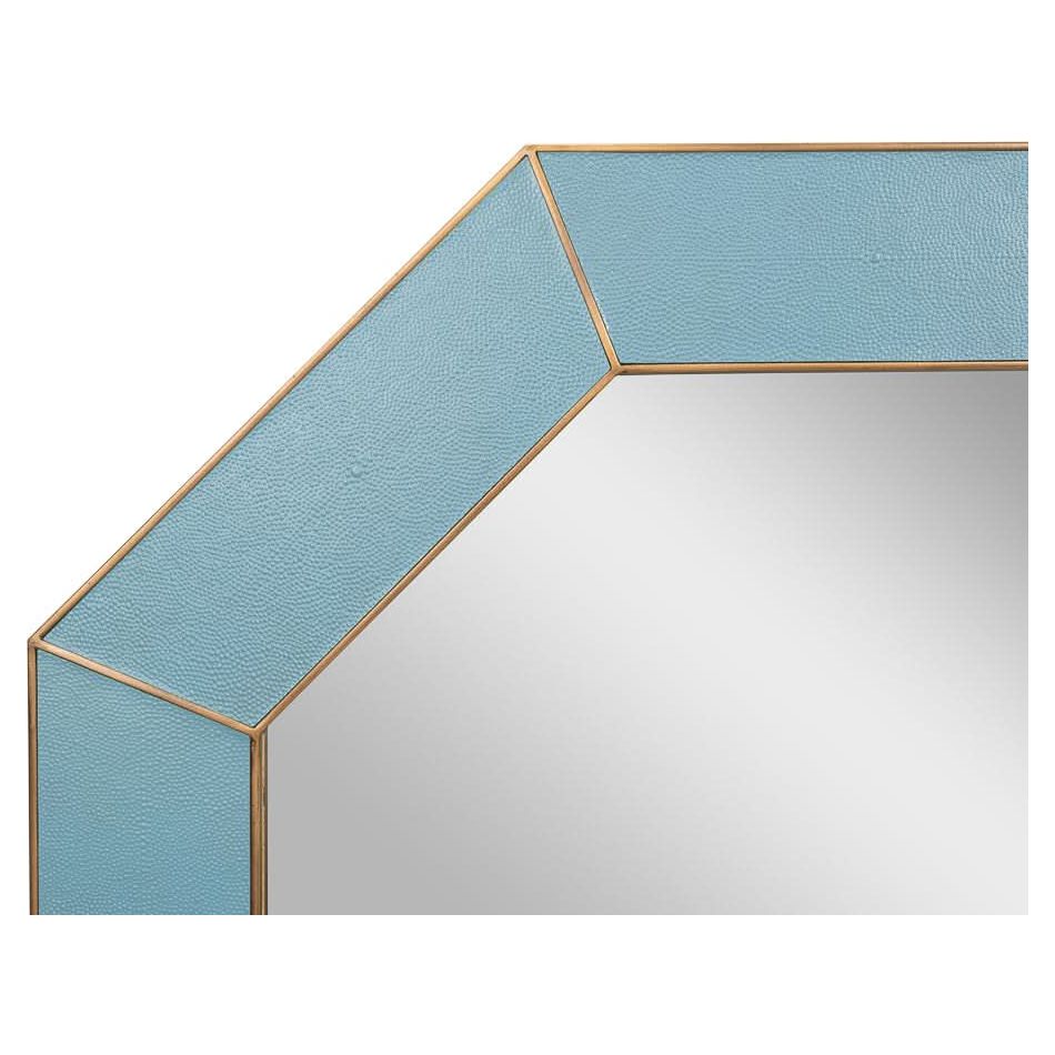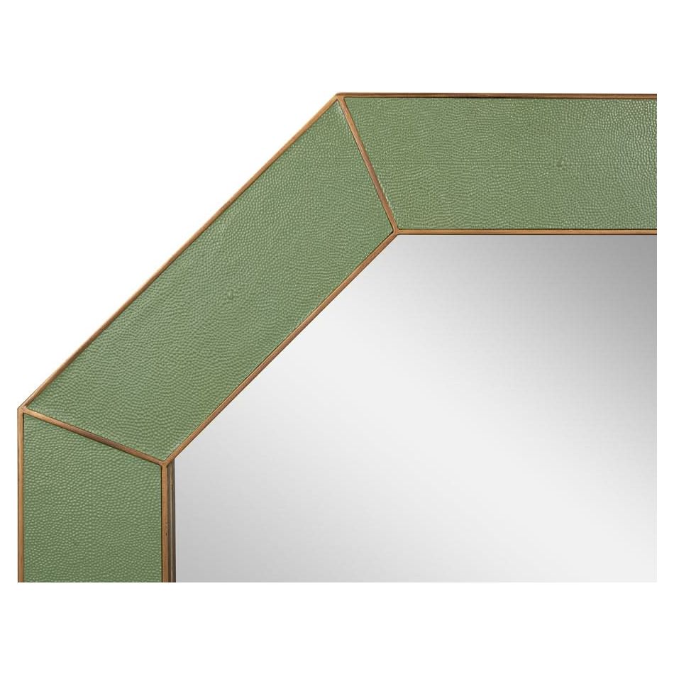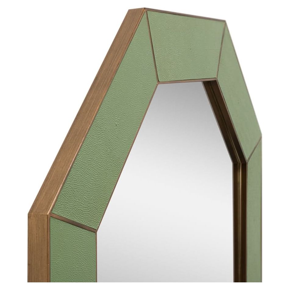 The octagonal frame of the watercress shagreeen leather adorned with handcrafted brass details surrounds a beveled mirror, elevating the design and complementing any room with its timeless elegance.