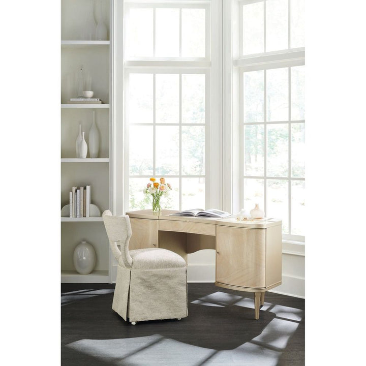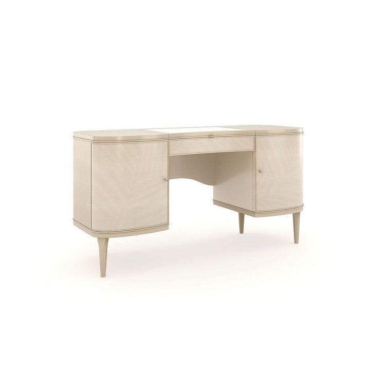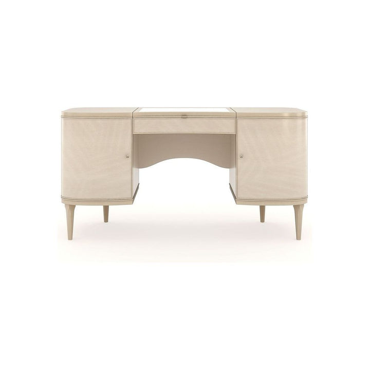 Whether you fancy a space to work from home, or space for getting ready, this multifunctional vanity introduces a casual, yet glamorous design. Inspired by the rippled edges of overlapping ginkgo leaves, its exquisitely grained Amapa veneer is highlighted by a Natural Glow finish. Encased in Champagne Pearl, it features doors on either side, each with a top drawer and pull-out bottom shelf with dividers for organized storage. Easily converts from an elegant writing desk to a dressing table with a flip-top mirror that conceals a removable jewelry tray and vinyl interior.