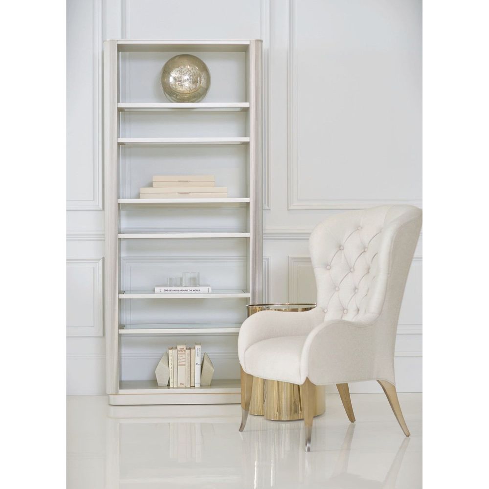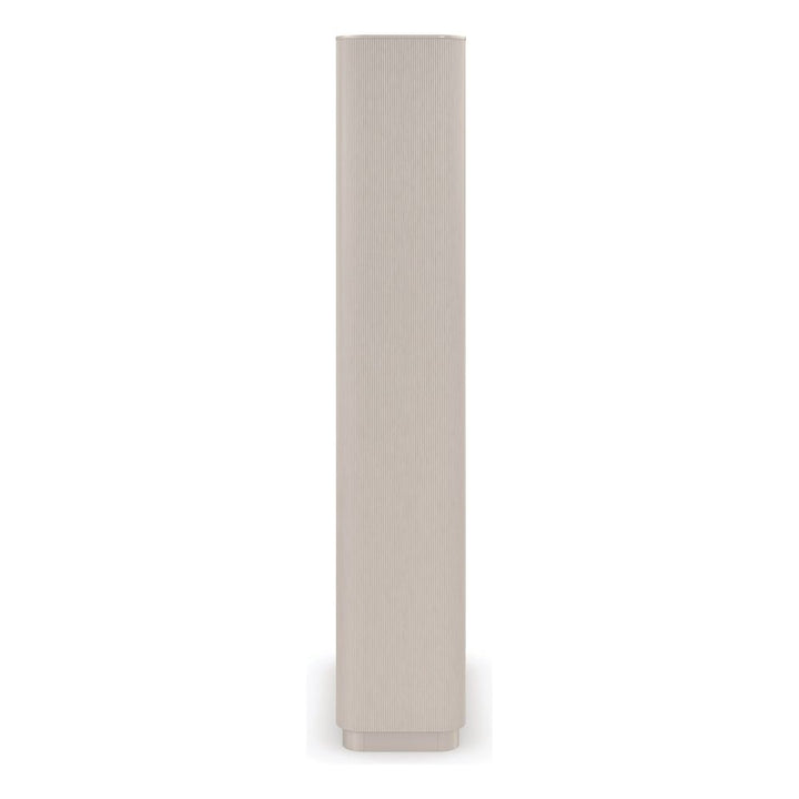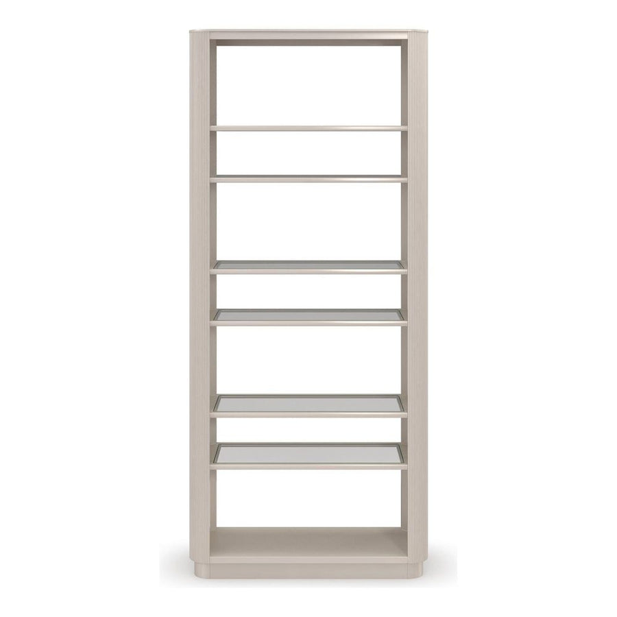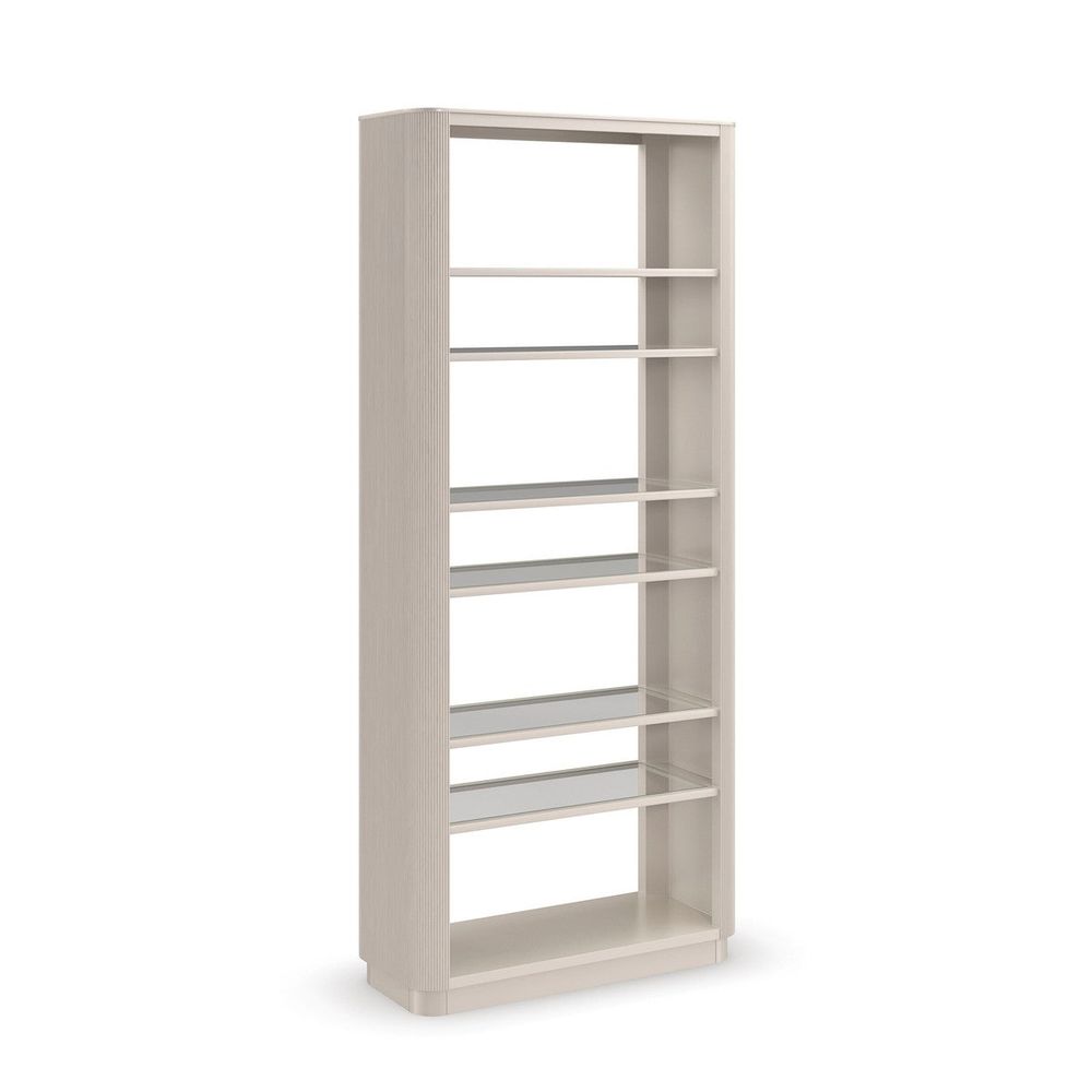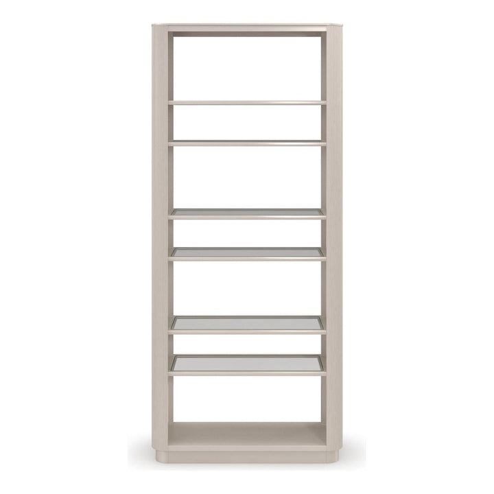 Elevate display for curated books and collectibles with this tall bookcase, crafted in Birch and Maple veneers in a Matte Pearl finish. Narrow reeding and softly rounded edges create a tactile frame for wood-rimmed glass shelves that allow for light and reflection. Style one or more against a wall to make an impact, or float away from the wall to divide an open space.