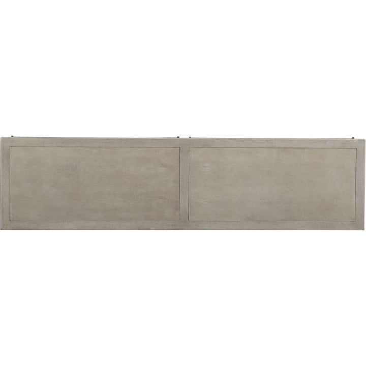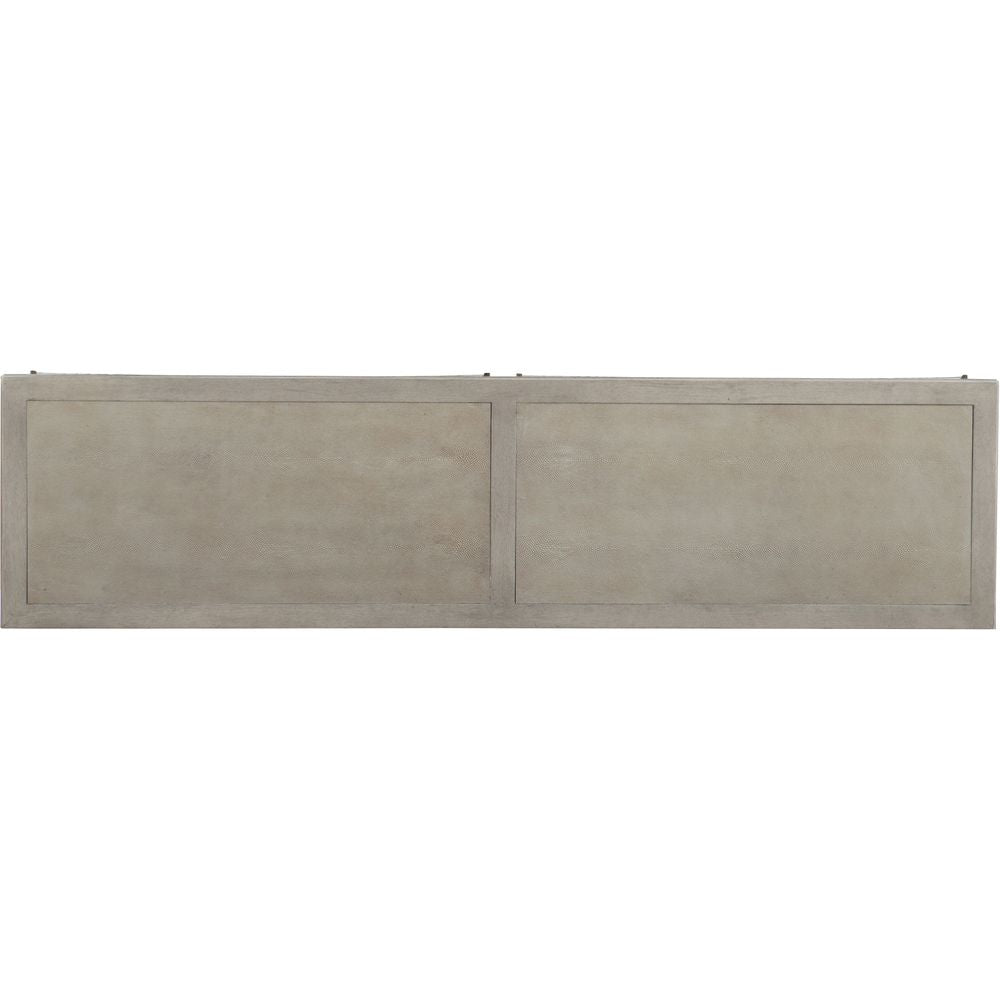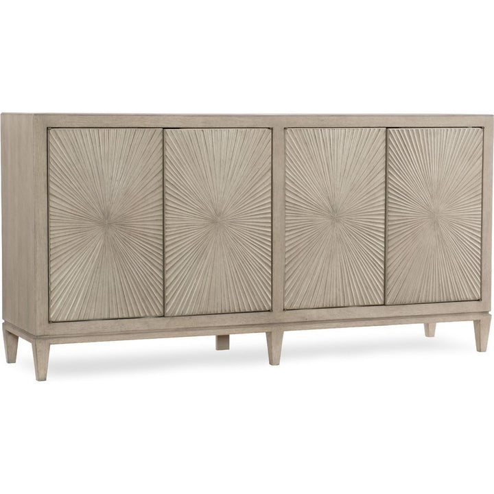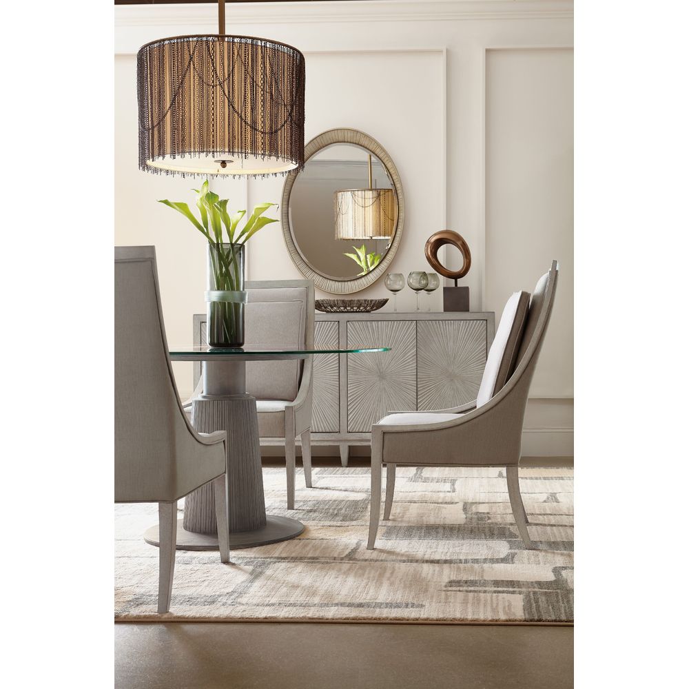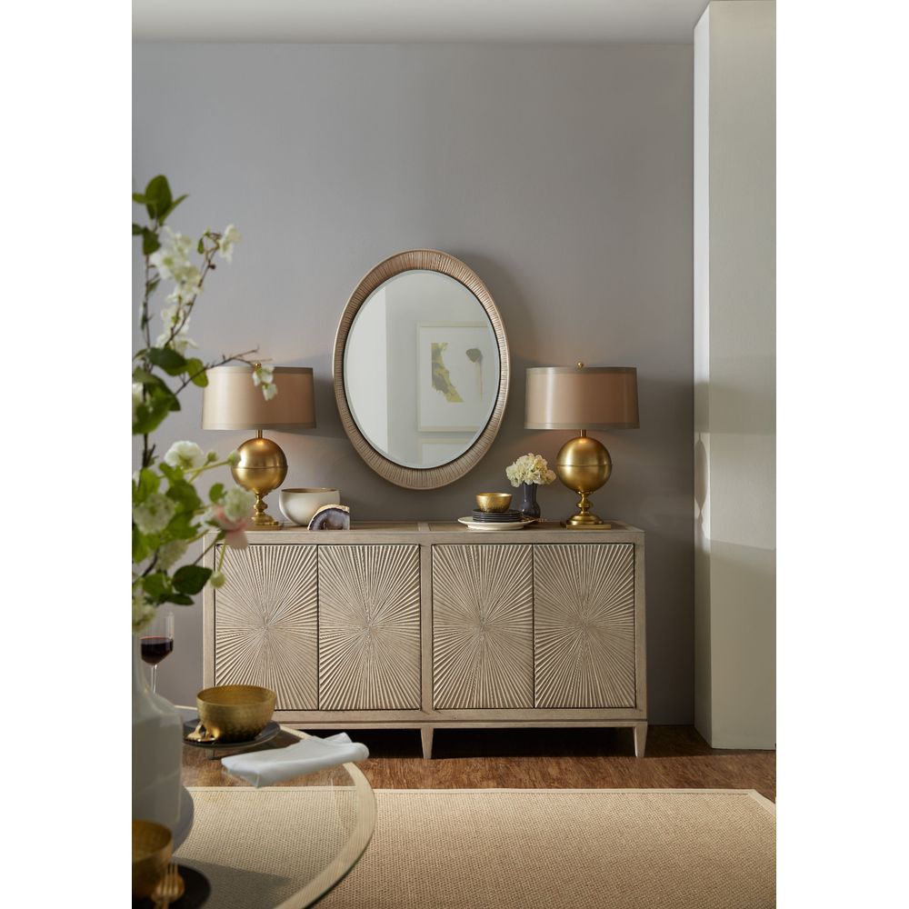 Elixir is a casual contemporary collection that, like its name implies, exudes a feeling of comfort, simplicity and well-being. While Elixir has crisp, clean lines, character and visual interest are also achieved through the use of texture. Textural interest comes from the use of lightly sand-blasted walnut veneer, light texture applied to the metal elements along with a hand-carved texture added to the surface of select pieces such as the oval mirror and the round dining table. The buffet offers a beautiful carved starburst pattern on the doors.