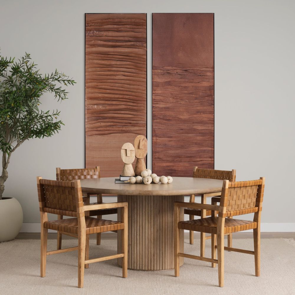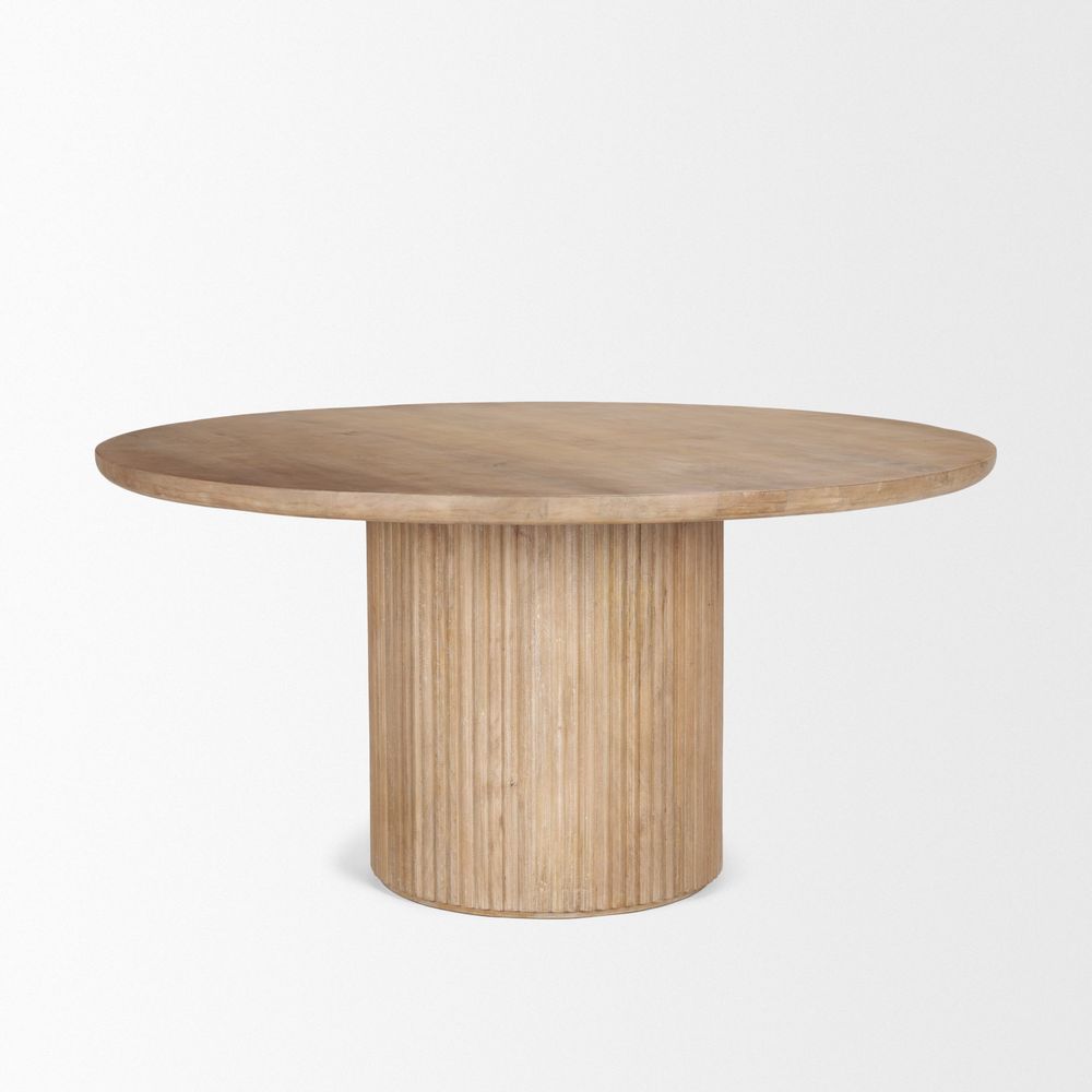 Description: A solid wood, contemporary dining table that features a smooth round top and a fluted round base finished in a light brown with subtle white pickling.