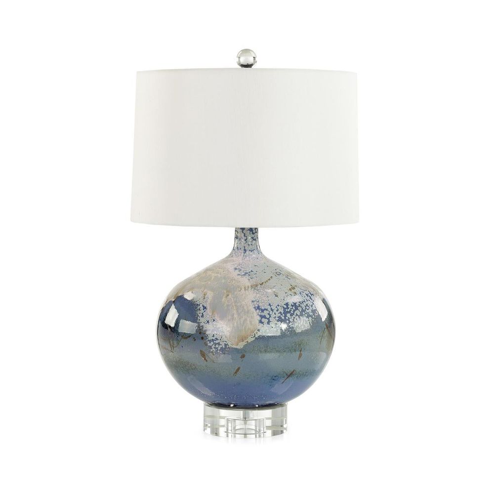 The Eloise Table Lamp is a gorgeous piece with a serene look, infusing an interior space with the tones of a cloudy sky. Crafted from glazed porcelain, the curvaceous piece features aged white tones overlying soft blues. This stunning design statement sits atop a round crystal base matched by an acrylic ball finial. The piece features steel neck hardware in a Nickel finish.