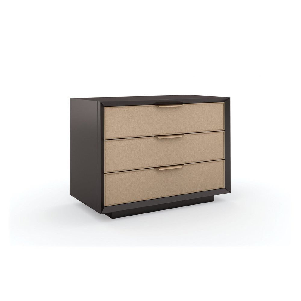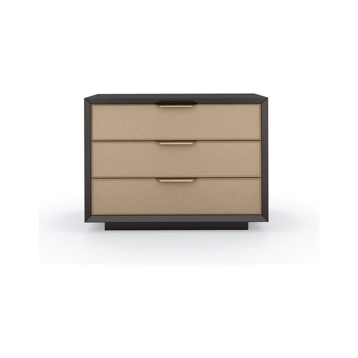 A brilliant bedside companion, this clean-lined nightstand merges minimalism with elements of mid-century modern design. Framed in a contrasting Dark Chocolate finish, three soft-closing drawers feature textured vinyl fronts, embossed with a rivulet pattern like rain trickling down a windowpane. Casting a warm glow, metal trim in Champagne Gold artfully incorporates rounded pulls to seamlessly frame each drawer. Features a USB port at the back along the top for charging convenience.