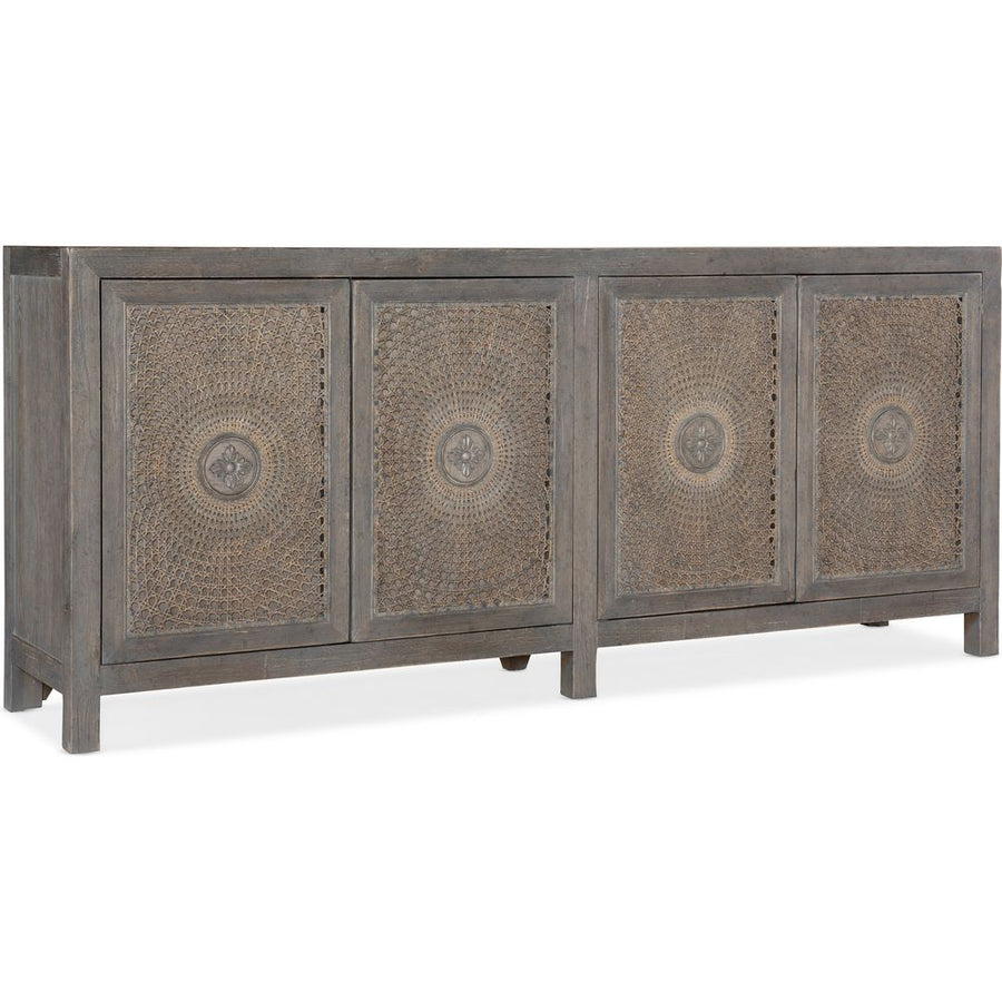 Tactile metallic floral medallion door fronts with cane inserts in a rich earth tone color palette make the Emmett Console a striking and stylish focal point. Crafted of Oak Veneers and Cane, the Emmett is media ready, featuring a ventilated back panel, FC705 3-plug electrical outlet and accommodating up to an 80-inch TV. Four wood-framed pieced cane doors with touch latches and soft-close hinges have 2 adjustable shelves behind each pair of doors and 2 utility drawers behind the doors on the left side. Come closer to Melange, and you will discover something unexpected. An eclectic blending of colors, textures, and materials in a vibrant collection of one-of-a-kind artistic pieces, Melange is meant to inspire you and fuel an experience of self discovery, inspiring a renaissance in your home. Each piece of Melange has its own story. The designs are versatile and timeless, easily transcending from one life stage to the next, from home to home and generation to generation.