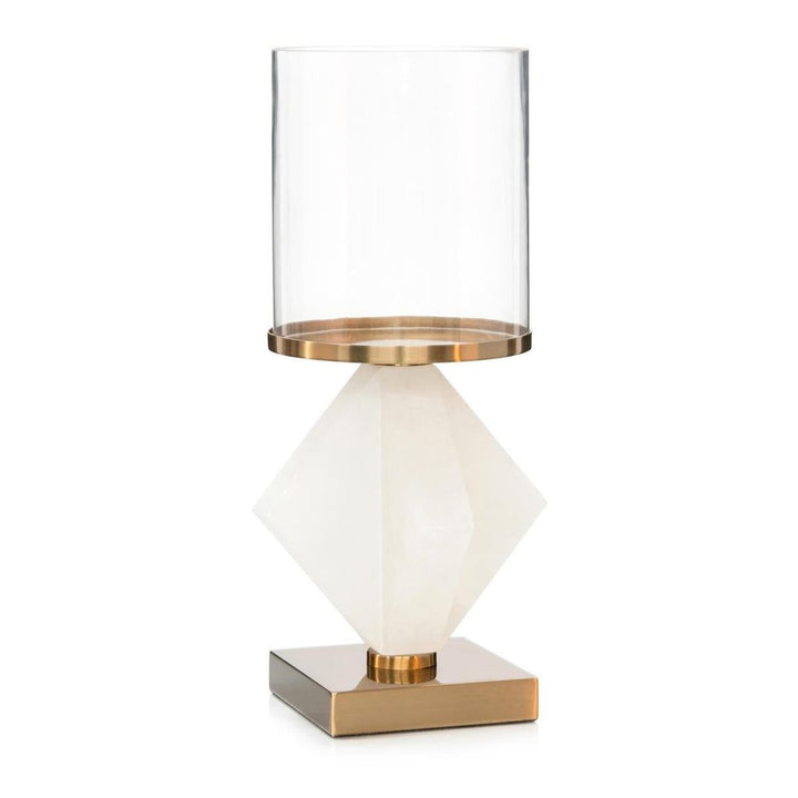 Description: Candlelight will twinkle and sparkle from inside this glass globe held by an alabaster and coffee bronze base.