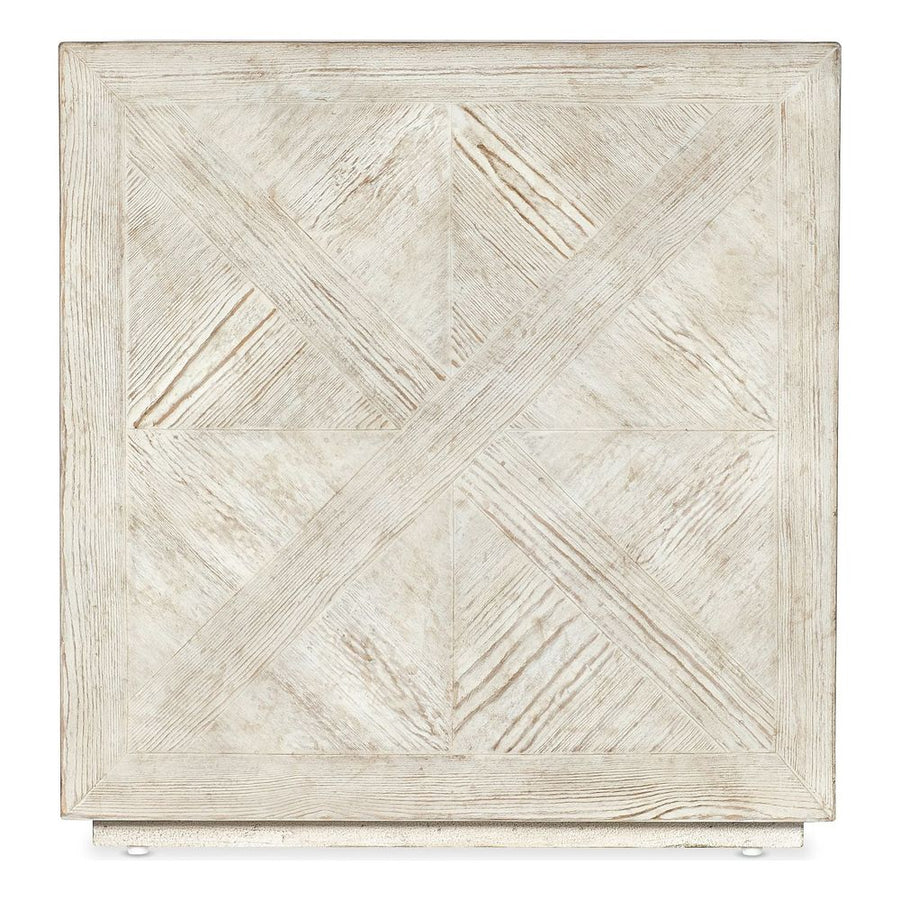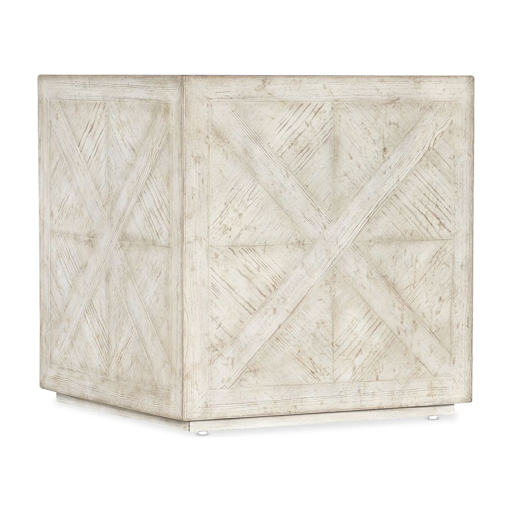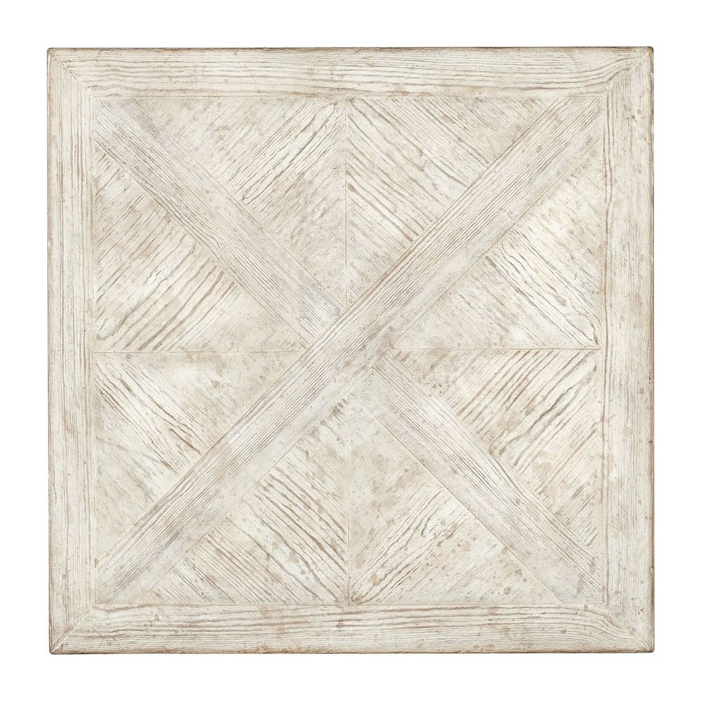 Description: In a cube-like form, the 24-inch square Block Buster End Table is crafted of Pine with parquet-patterned veneers in a creamy white finish with rub-through and distressing and a plinth base.
