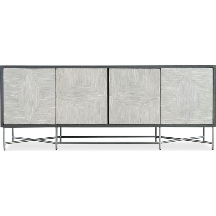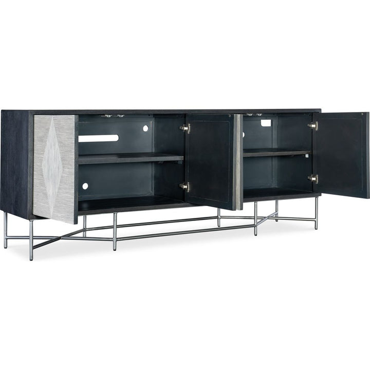 Description: Cool, calm and chic, the Fine Lines Credenza is crafted of Mango Solids in a natural black wood finish with a brushed pewter metal base. On the door fronts is a black and white bone design in a diamond motif. The 4 doors have soft-close hinges and touch latches, and the interior finish matches the outside of the case. There's one removable shelf behind each pair of doors. A ventilated back panel and wire management make the credenza media-friendly.