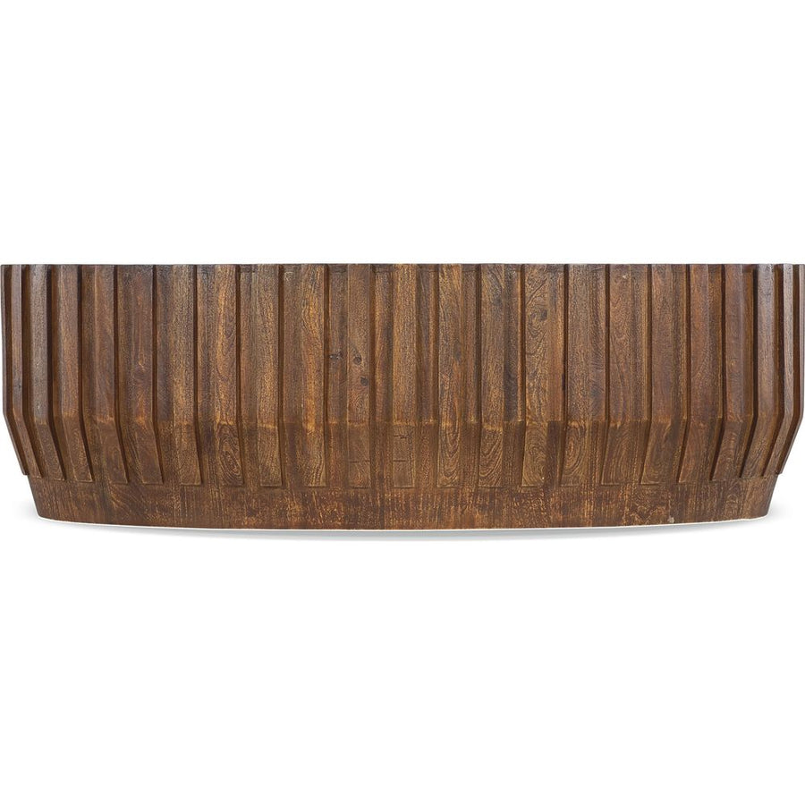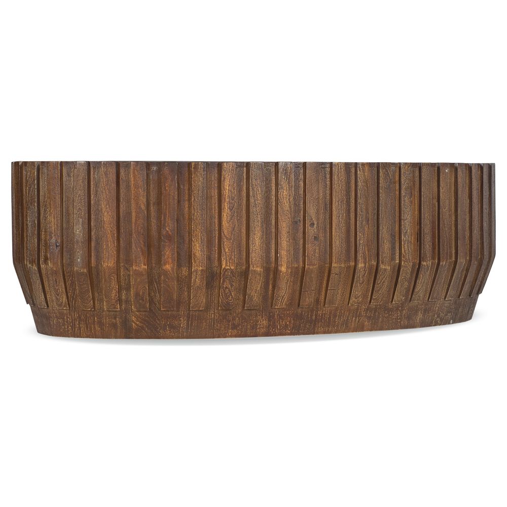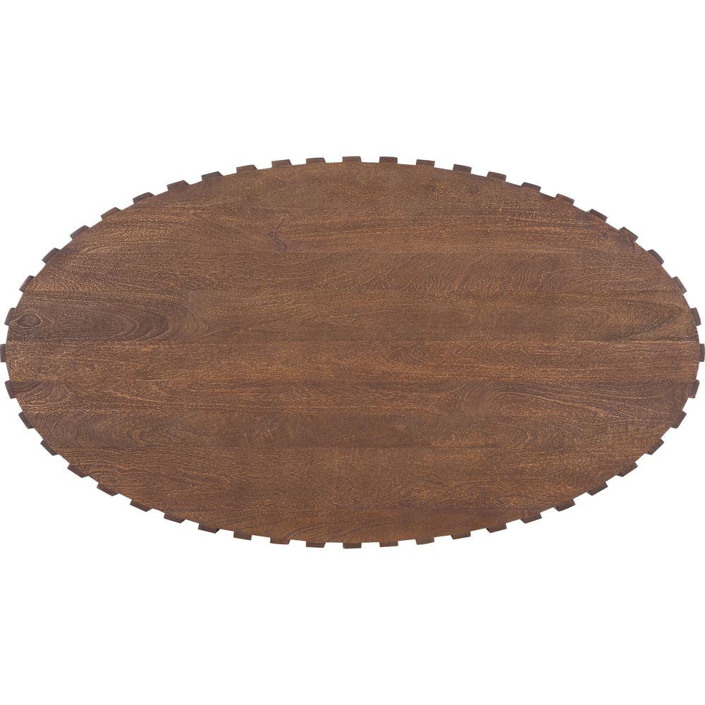 Description: Industrial meets organic in the 58-inch wide oval Gears Cocktail Table, crafted of Mango Solids in a natural medium wood finish in a ribbed design in a gear motif.