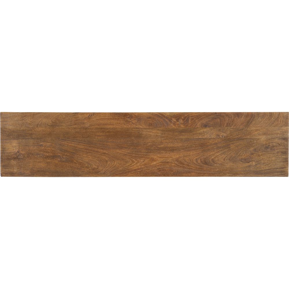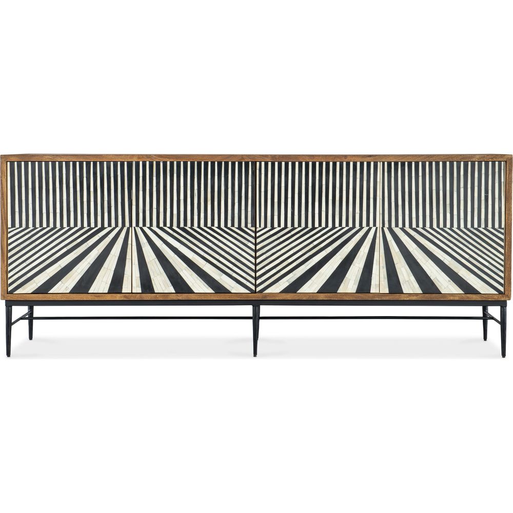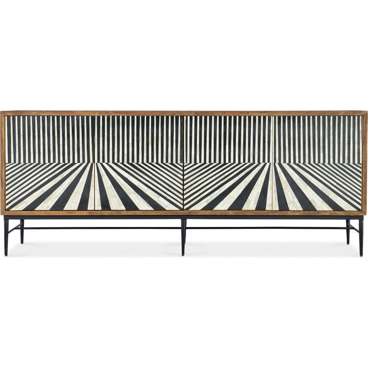 Description: In a classic black and white color scheme with a casual modern twist, the Linear Perspective has a natural medium wood finish over Mango Solid Wood accented by black and white bone inlay on the door fronts and a black metal base. The 4 doors have soft-close hinges and touch latches and one removable shelf is behind each pair of doors. A ventilated back panel with wire management makes the credenza media-friendly.