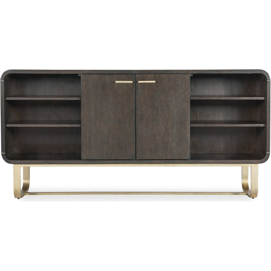 Description: A sleek gold metal base and accents combine with a dark finish over Oak Veneers to create the chic and multi-functional Metropolitan Credenza. Use it as a bookcase, entertainment center, storage piece, entry piece or serving piece. There's one adjustable shelf behind the pair of center doors, two adjustable shelves on the left and right sides, and the back panel behind the doors has ventilation and wire management. Measures 74 W x 19 D.