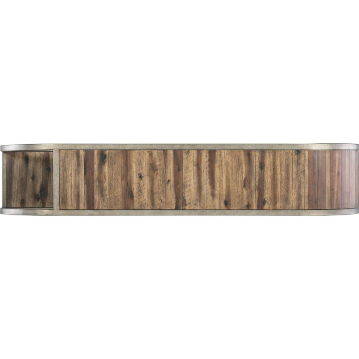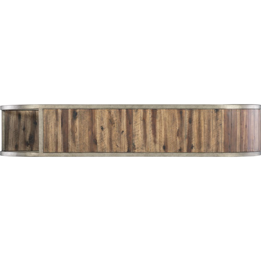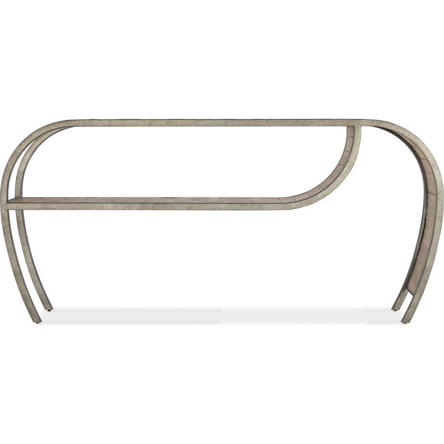 Description: In a dynamic blend of shape and materials, the Open Ended Console Table combines a pewter metal frame with a planked-wood motif in a natural medium wood finish with distressing and visible knots. The curved design has one fixed shelf and measures 74 W x 14 inches deep.