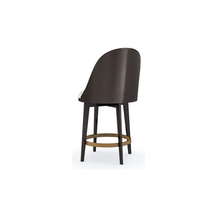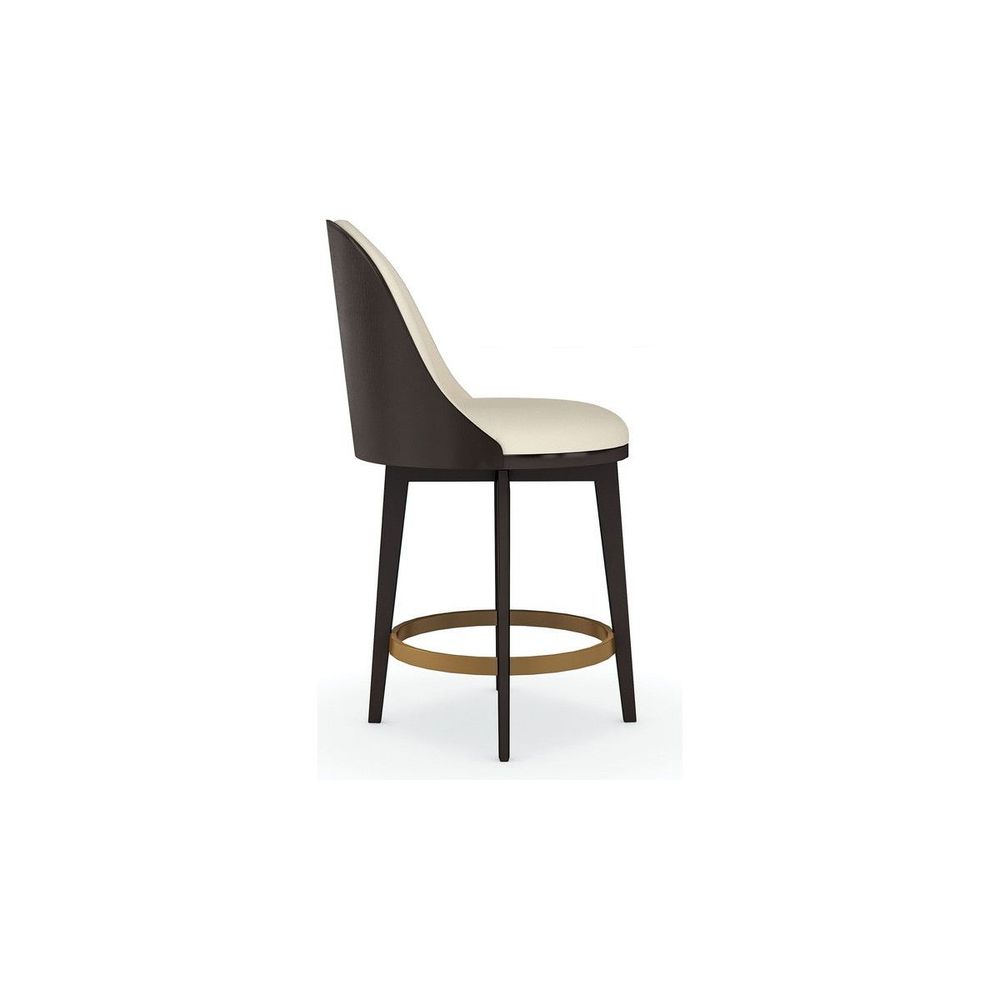 Luxuriously dressed in an embossed vegan leather, this elegant modern counter stool invites you to linger over coffee and mimosas at the breakfast counter. Features a comfortably curved back in a Dark Chocolate finish, perfectly poised on tall tapered legs. A metal hoop in Champagne Gold, set at just the right height for getting in and out, adds shimmer and gives leverage to swivel with ease. Pairs well with elevated desks and workstations.