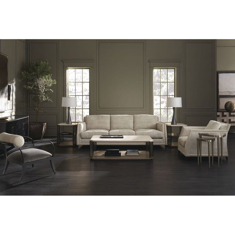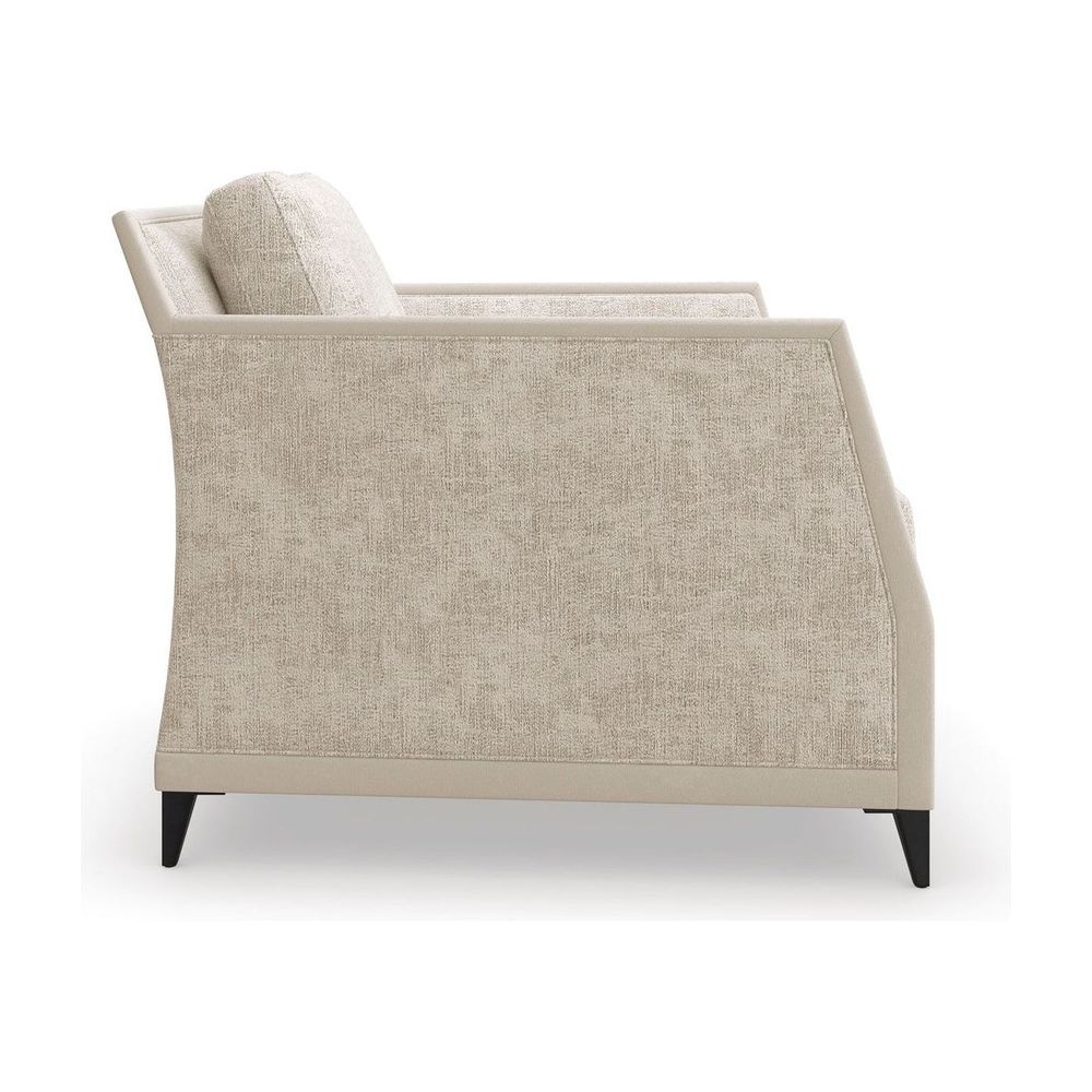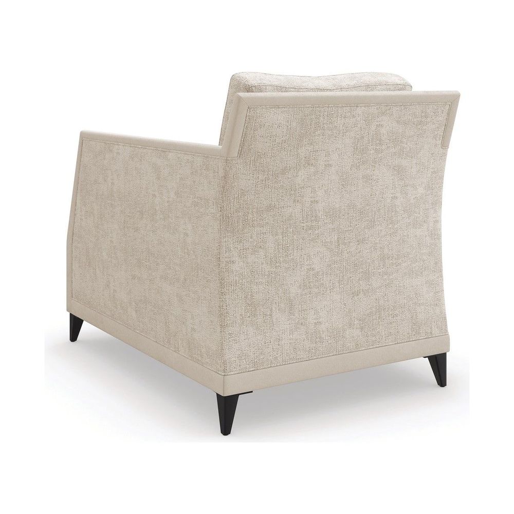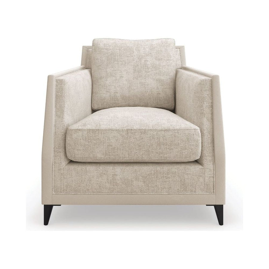 Meticulously tailored yet beautifully worn in a distressed chenille fabric, this versatile chair introduces a classic silhouette with Art Deco influences. Accentuating subtly angles and a sophisticated profile, a micro suede border lends tonal contrast and texture, warmly complemented by tapered feet in a Brushed Deep Bronze metal.