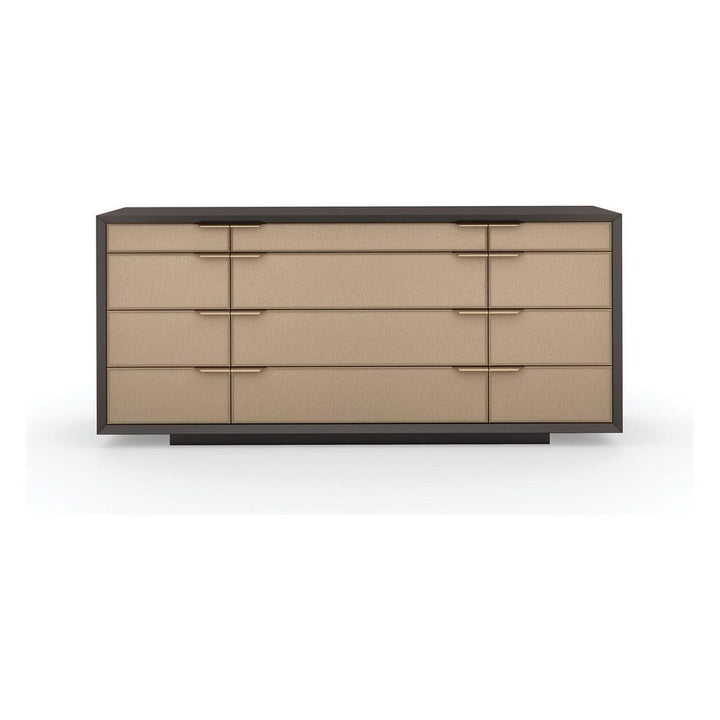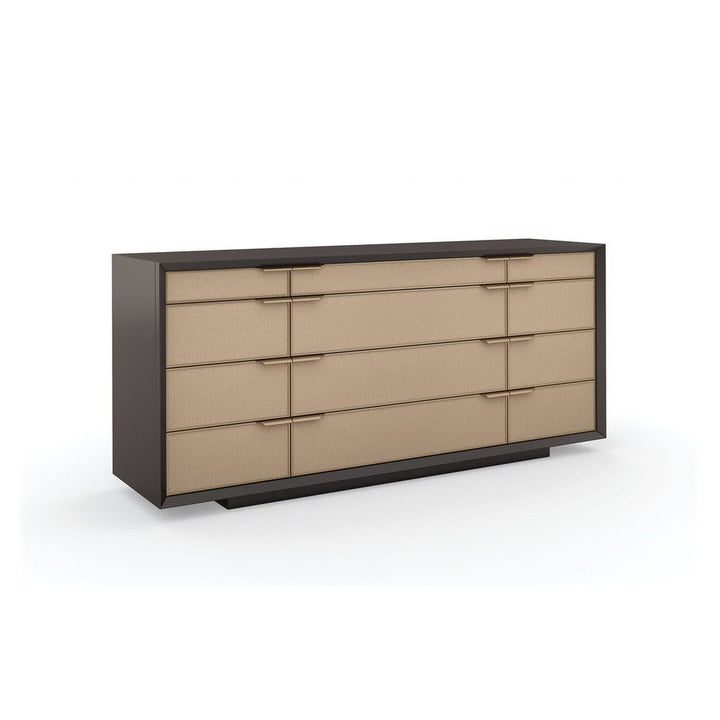 Merging minimalism with elements of mid-century modern, this streamlined dresser introduces a sophisticated style to bedroom interiors. Each drawer front is wrapped in a beautifully textured vinyl, embossed with a rivulet pattern like rain trickling down a windowpane. Casting a warm glow, metal trim in Champagne Gold artfully incorporates rounded pulls to seamlessly frame each drawer. Offers generous storage with soft-closing features and two felt-lined top drawers for an added note of luxury.